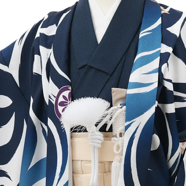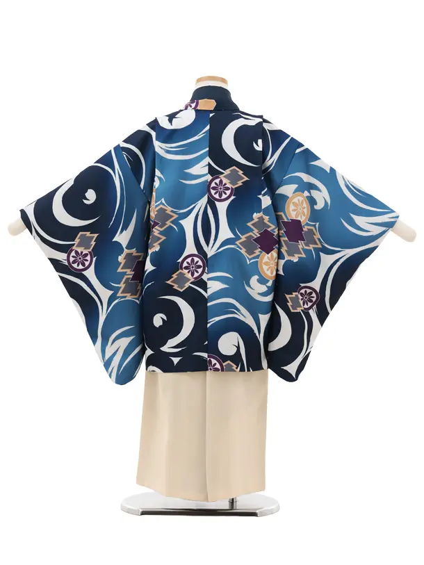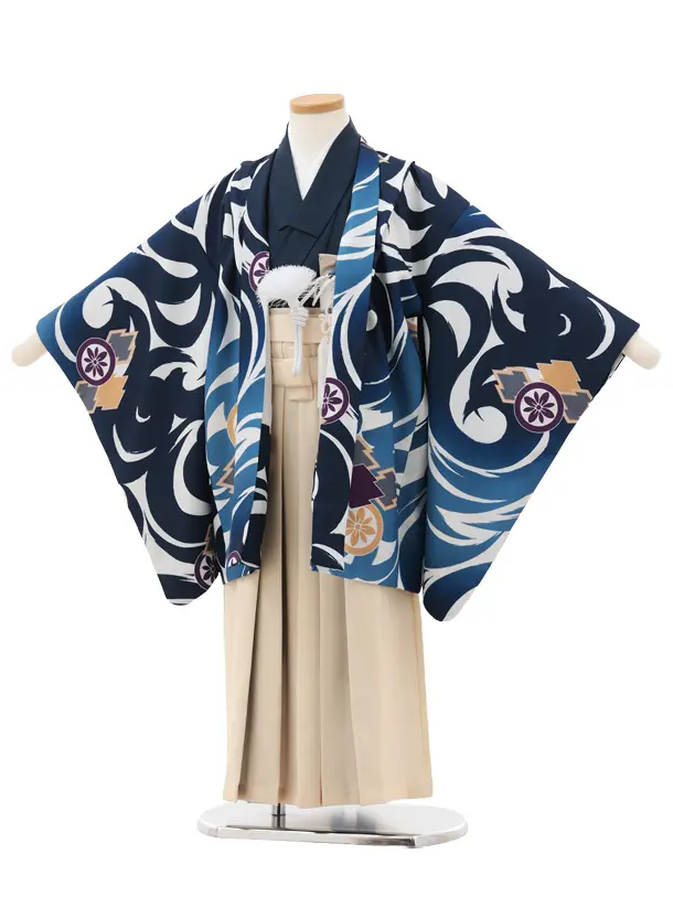 かんたん七五三(5歳男袴)X787 白ブルー丸紋 松皮菱×クリームベージュ