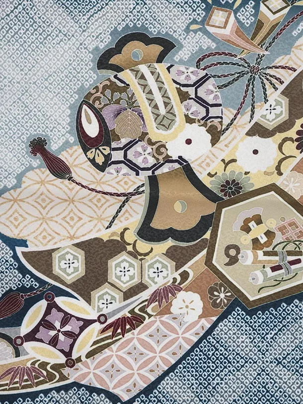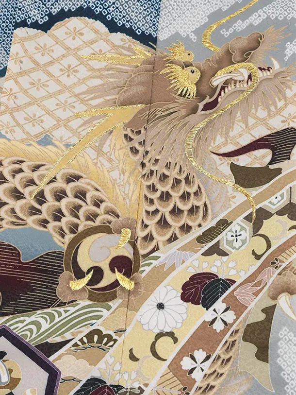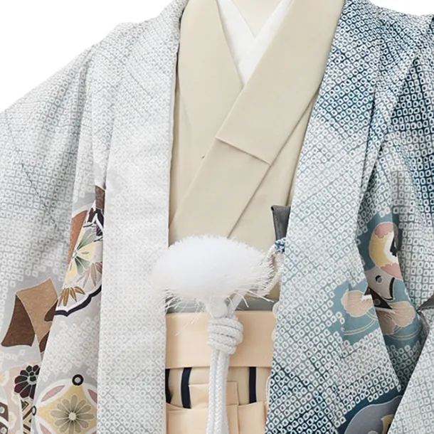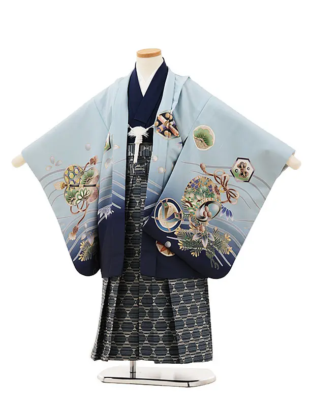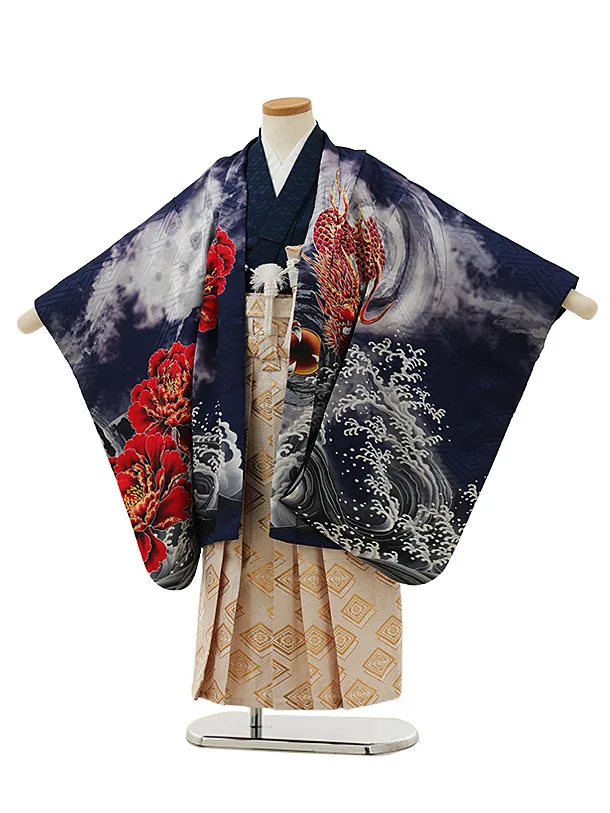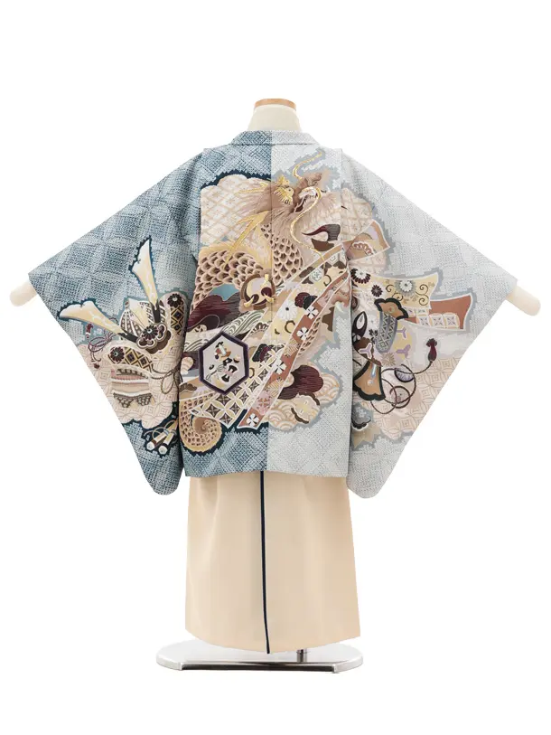 かんたん5歳袴 X791 ブルー疋田柄 片身替り 吉祥文様に龍×ベージュ