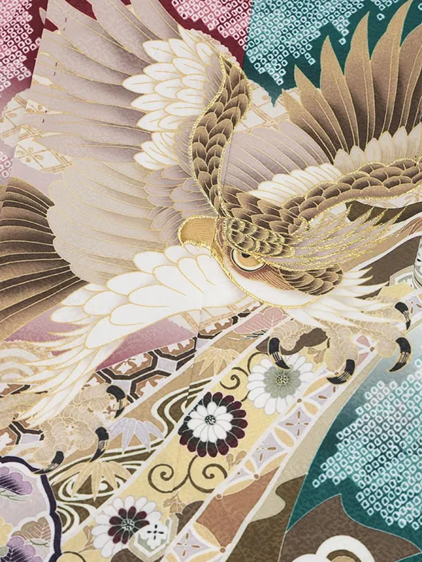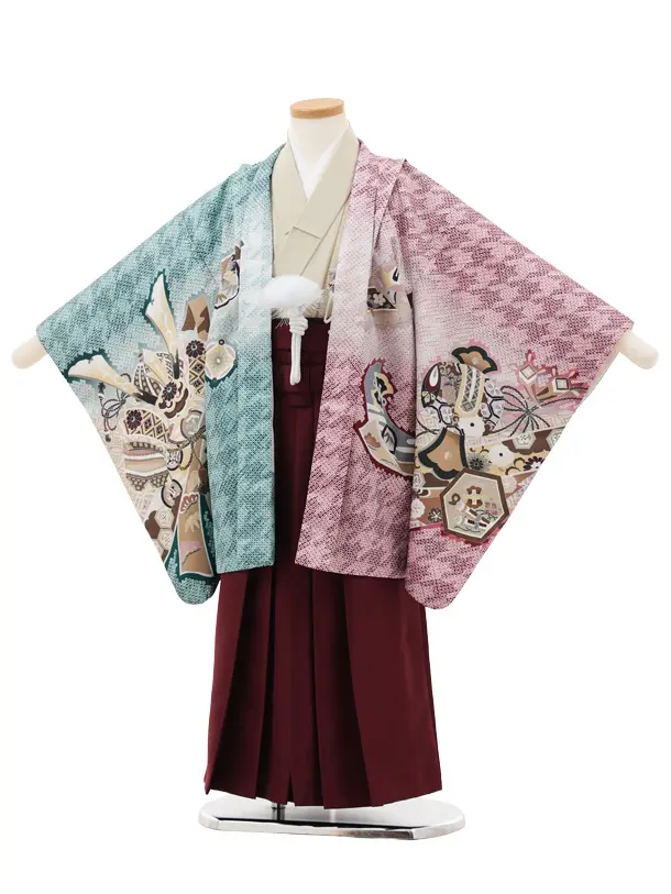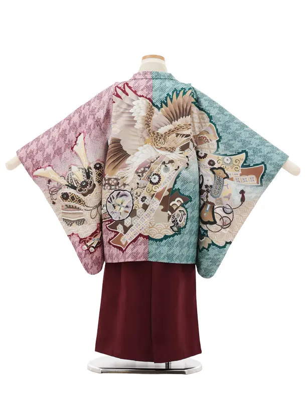 かんたん5歳袴 X794 赤×緑 疋田柄 片身替り 吉祥文様に鷹×ボルドー