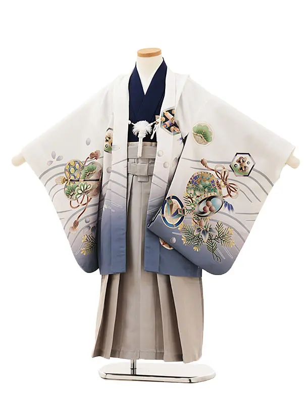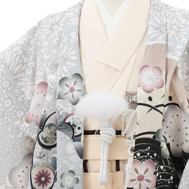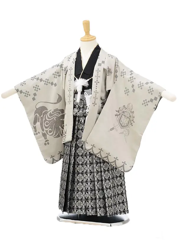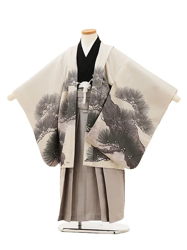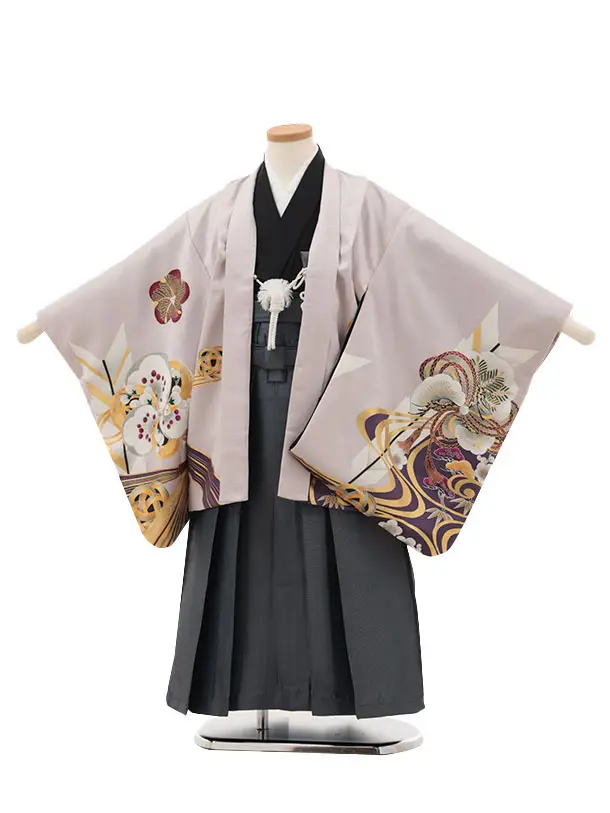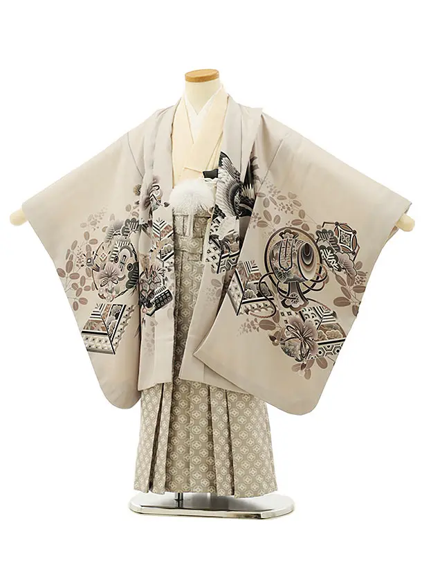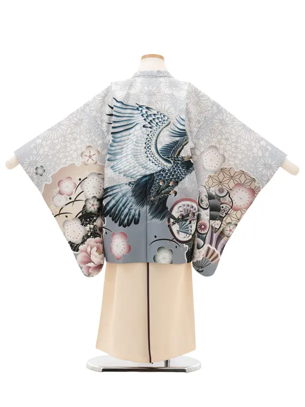 かんたん七五三(5歳男袴)X799 グレー梅花に鷹×クリームベージュ
