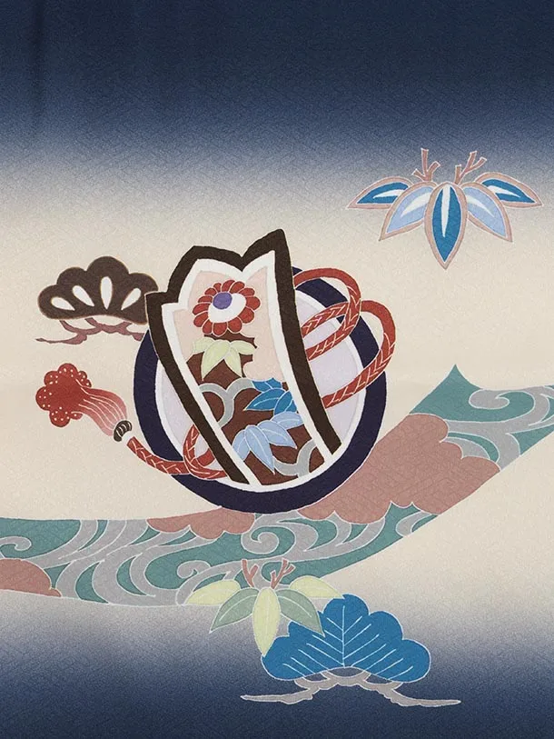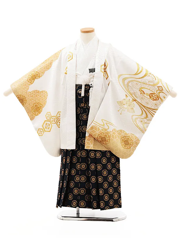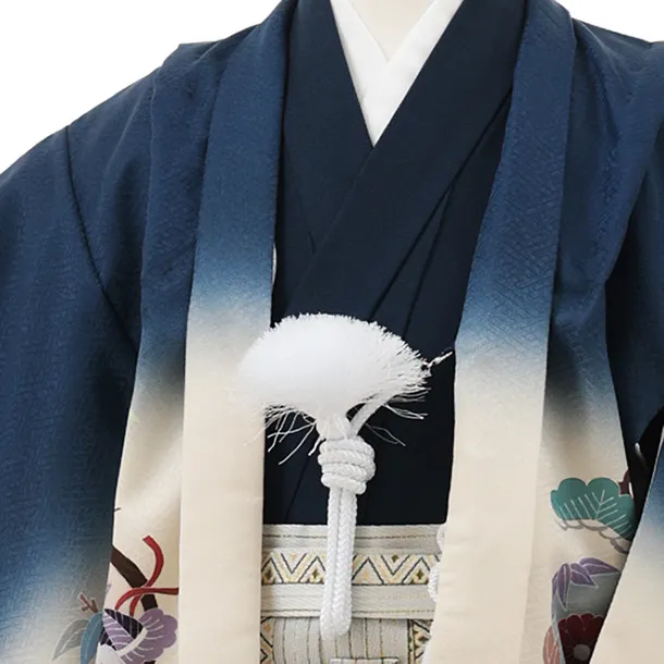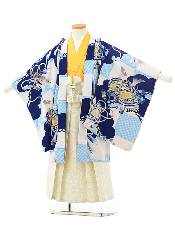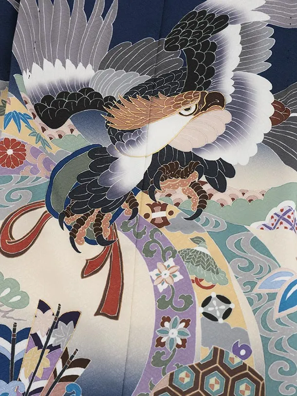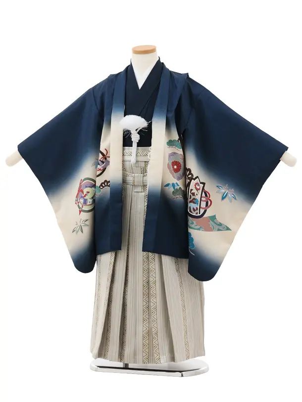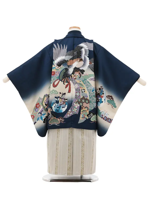 かんたん5歳袴 X803 紺地 束ね熨斗に鷹×ベージュゴールドストライプ