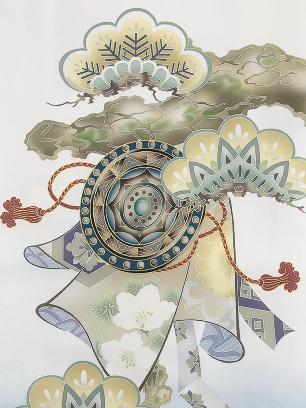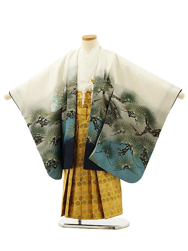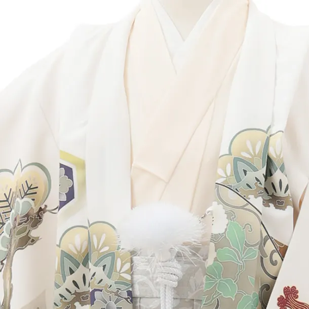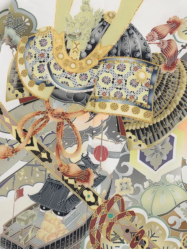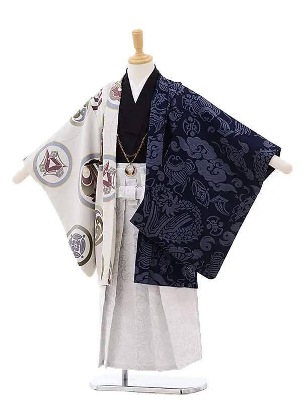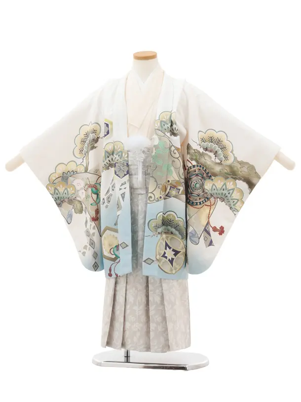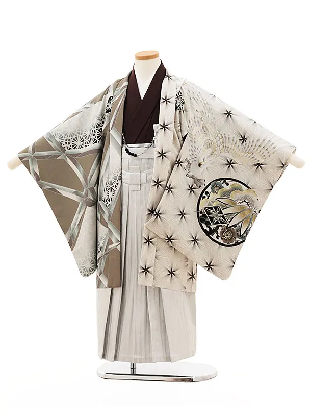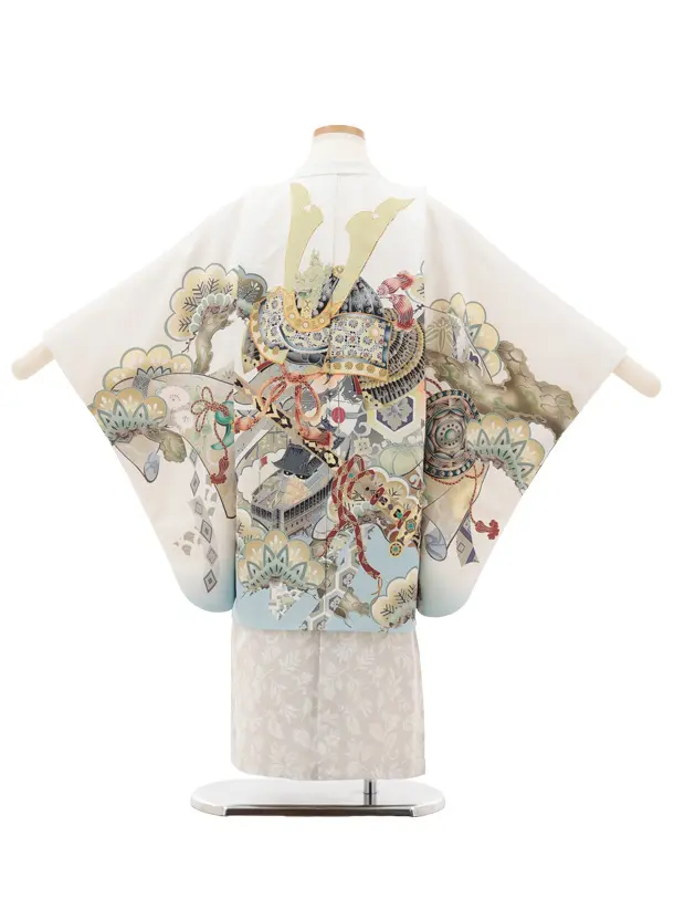 かんたん七五三(5歳男袴)X813 白地武具に兜×薄グレージュ