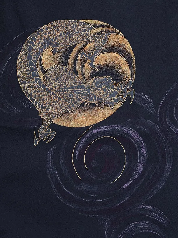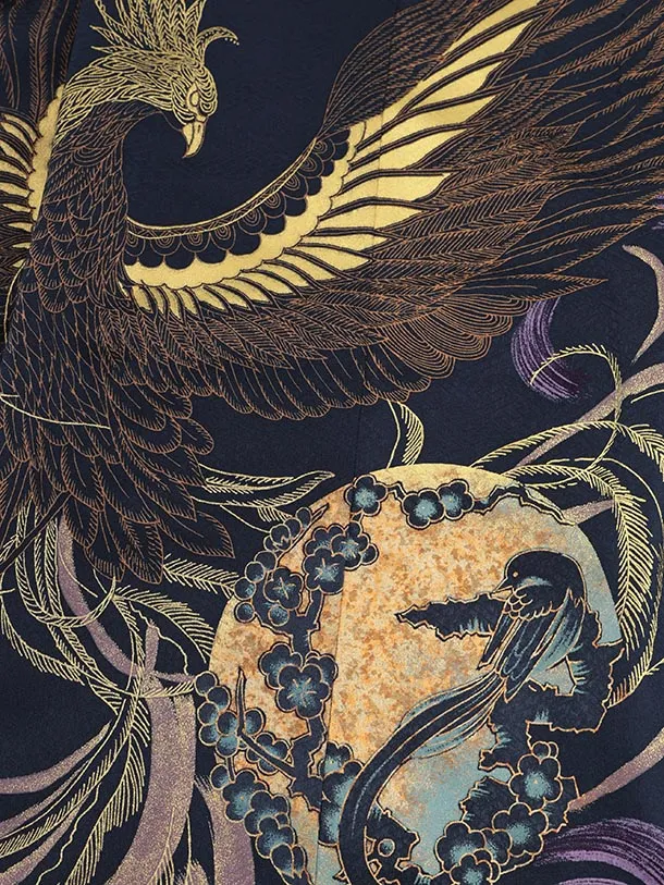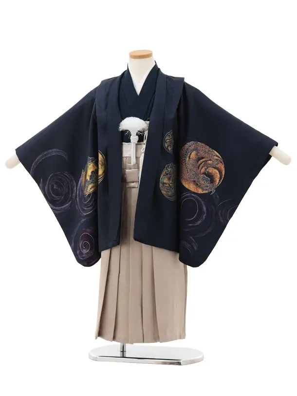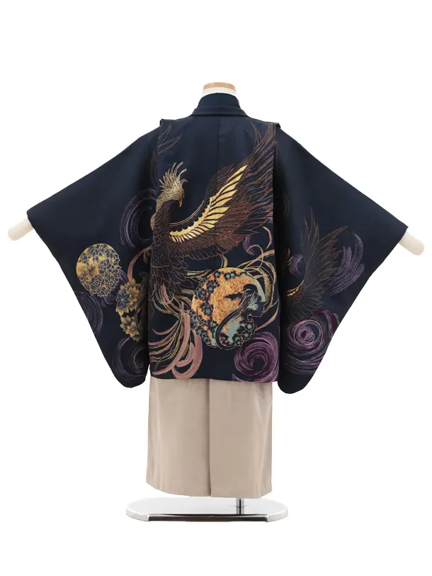 かんたん七五三(5歳男袴)X816 紺地 渦に鳳凰×ゴールドベージュ