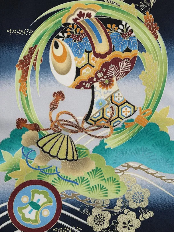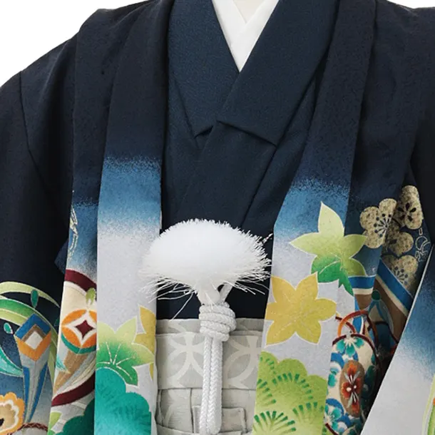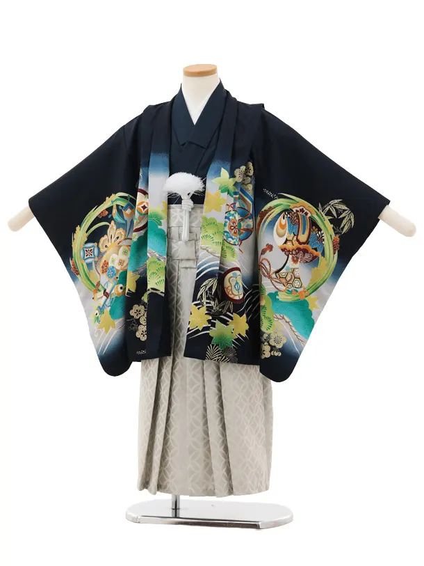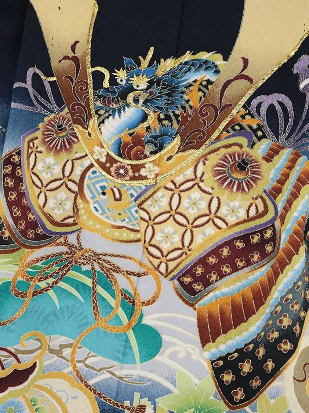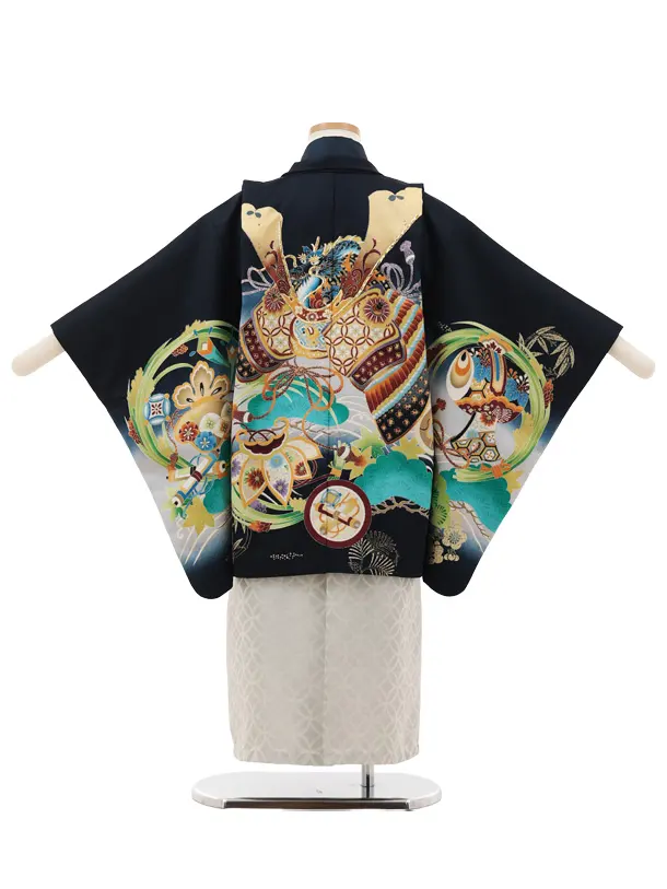 かんたん七五三(5歳男袴)X836 紺地 吉祥文様に兜×白シルバー
