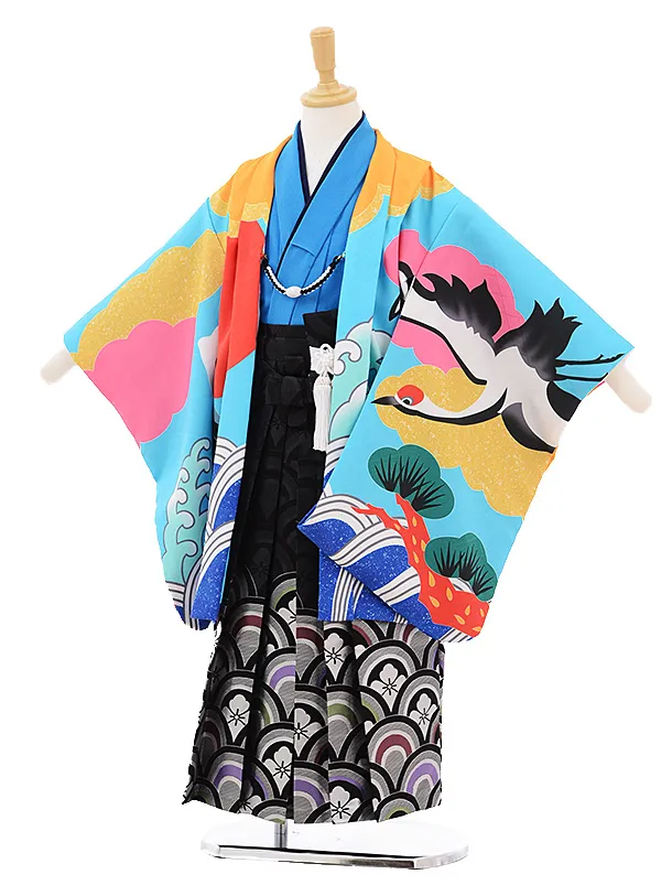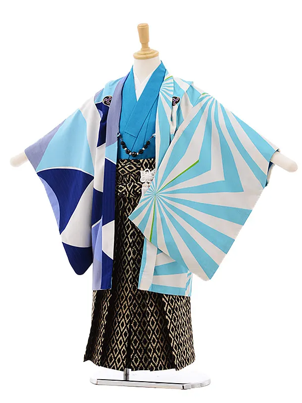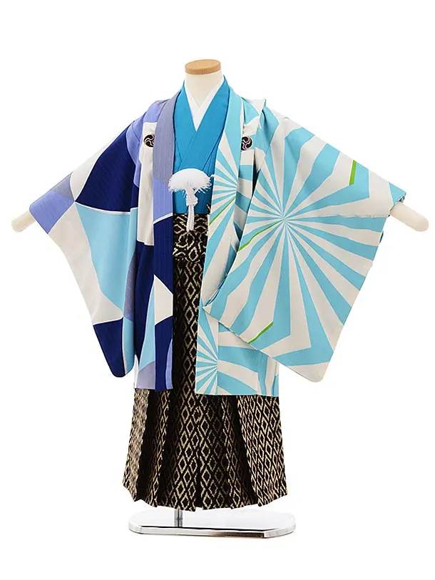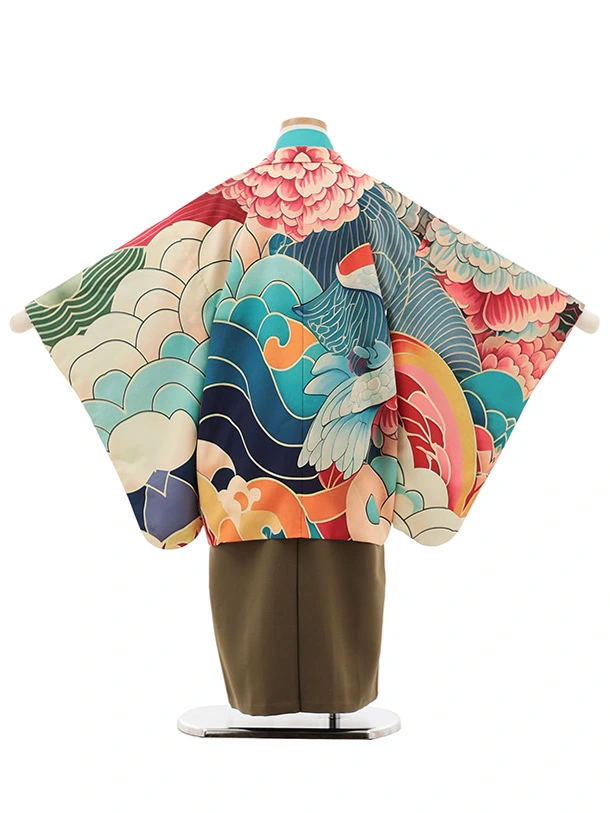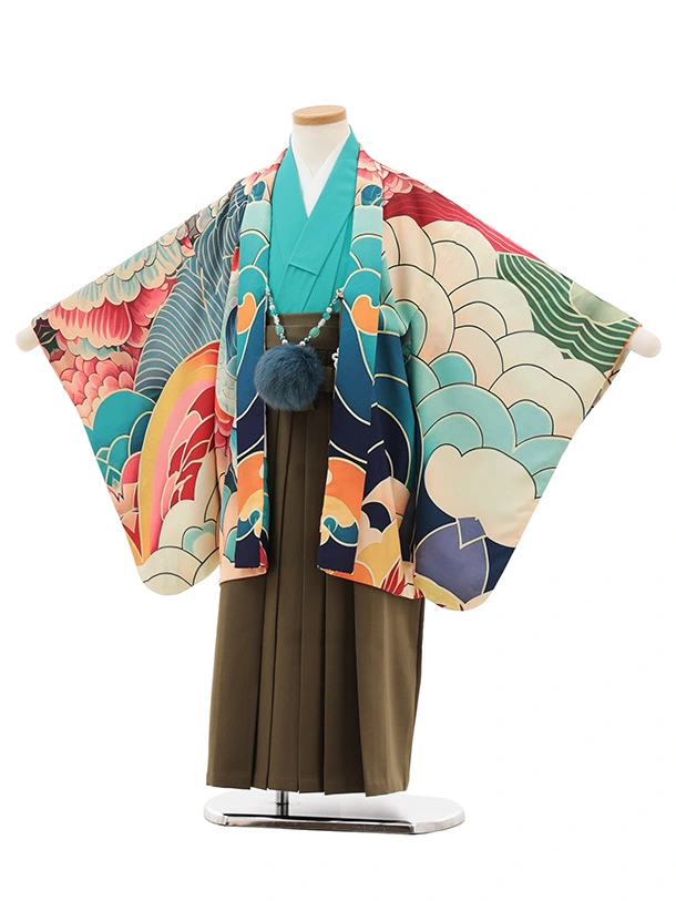 七五三レンタル(5歳男袴)X839 カラフル波に幻の魚×モスグリーン
