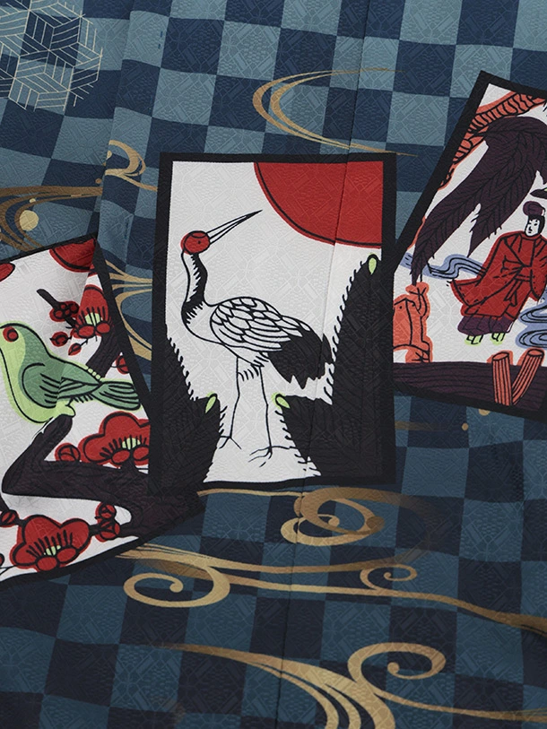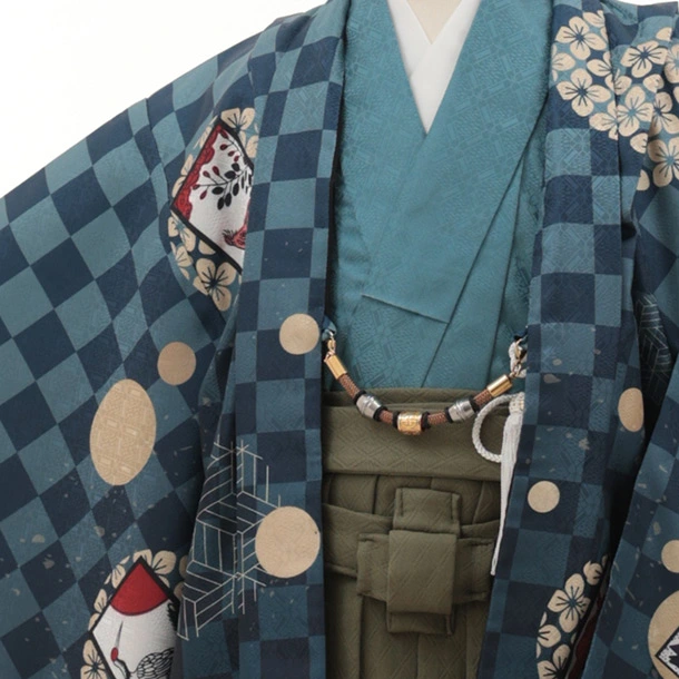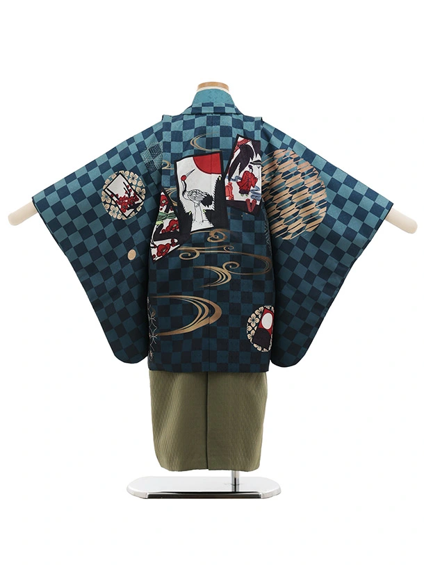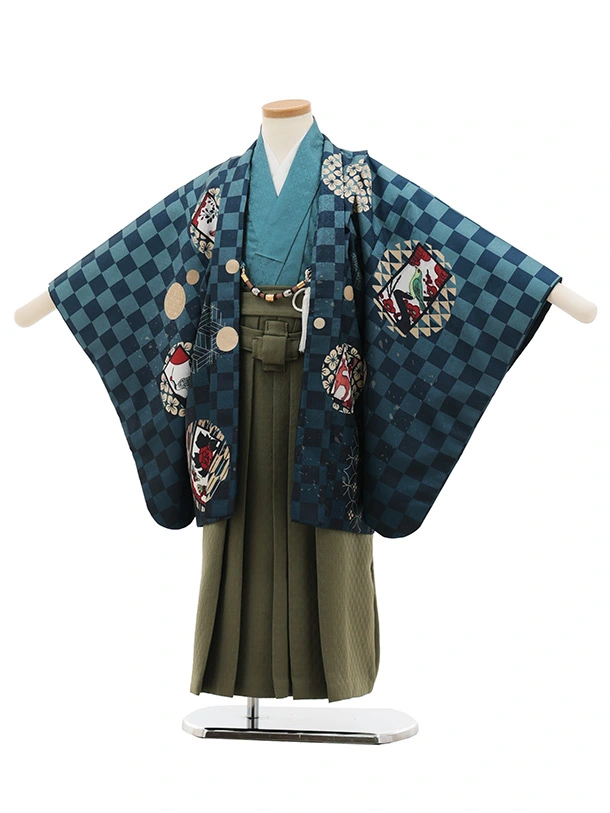 かんたん七五三(5歳男袴)X853 ブルーグリーン市松花札×モスグリーン