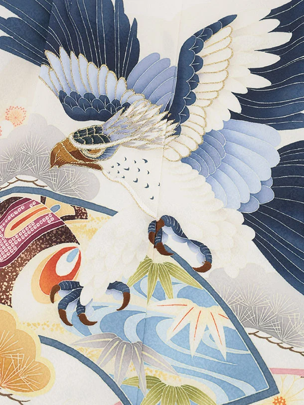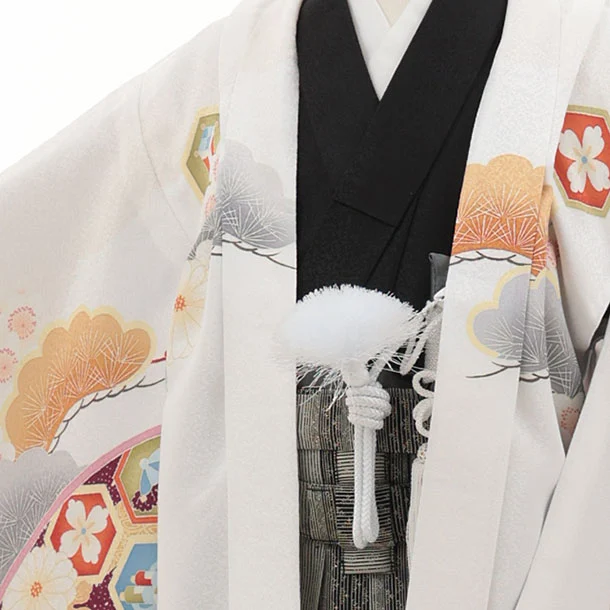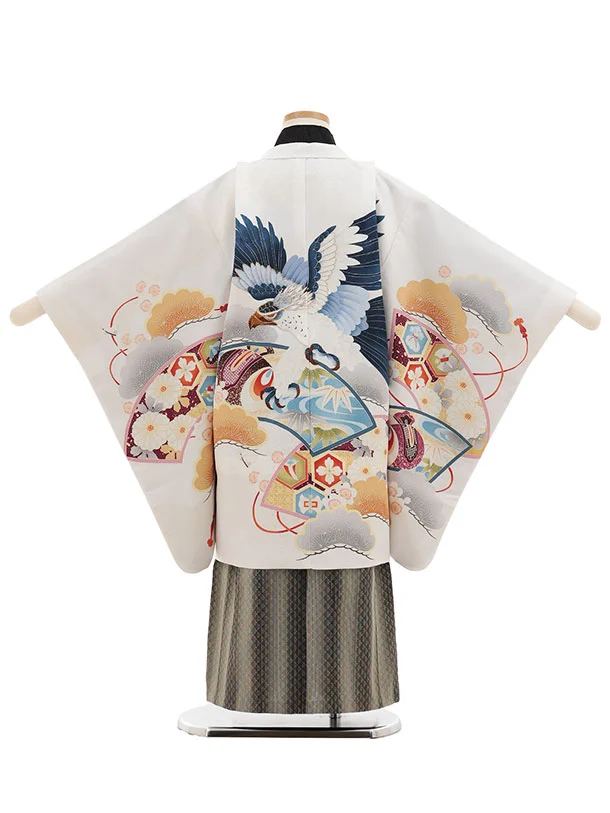 かんたん七五三(5歳男袴)X866 白地扇絵に鷹×グレージュ縞