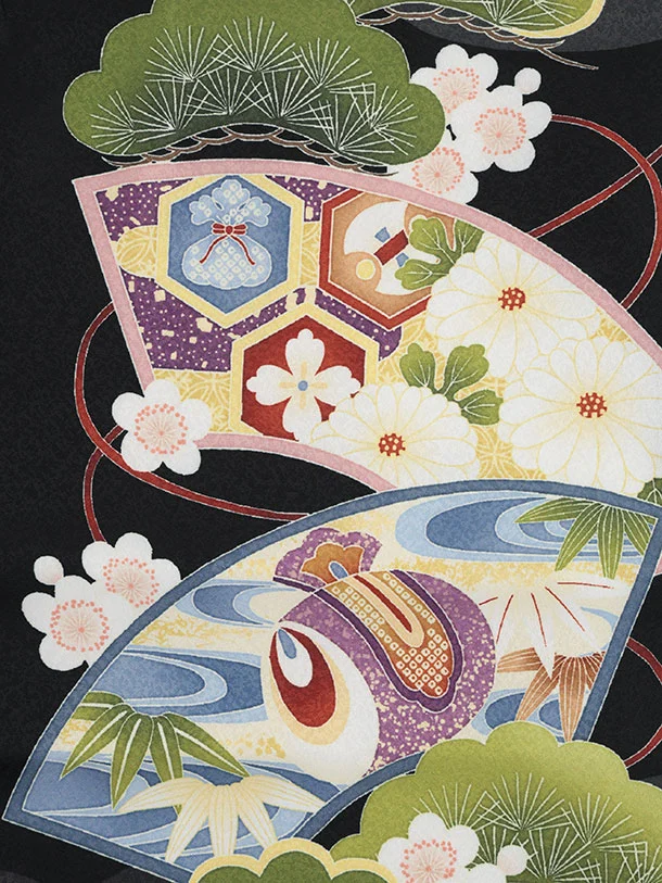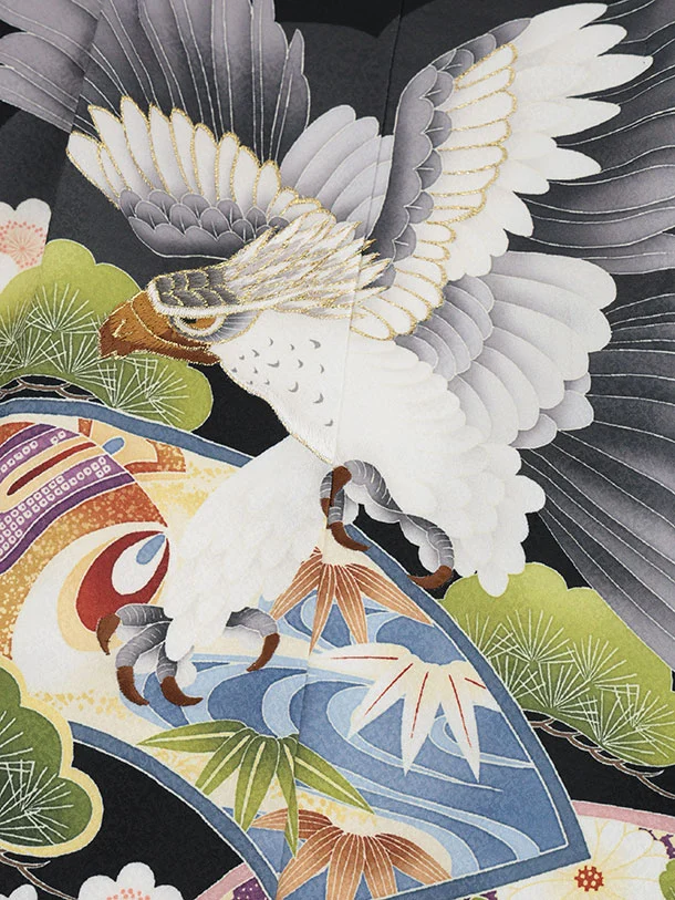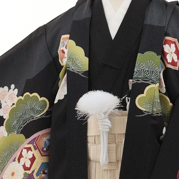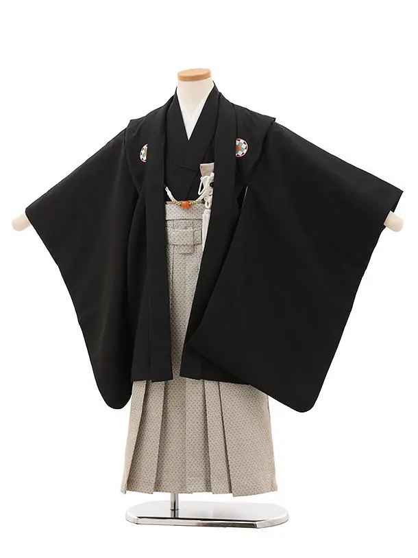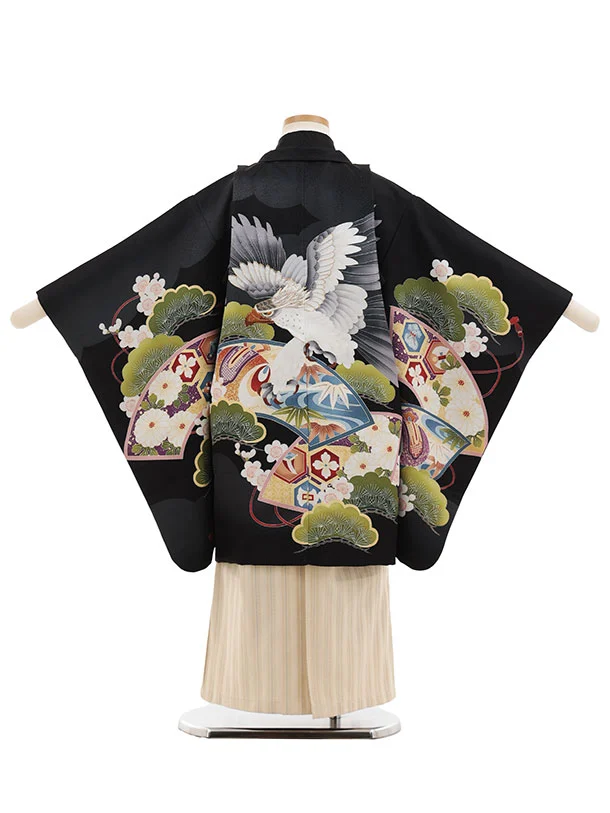 かんたん七五三(5歳男袴)X869 黒地扇絵に鷹×ベージュ