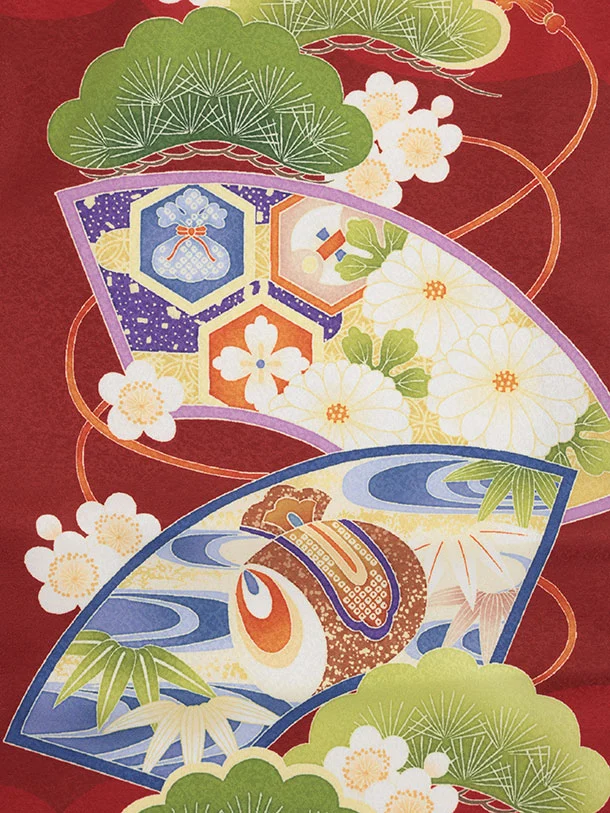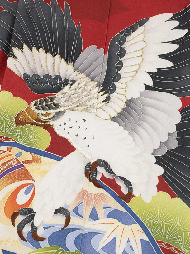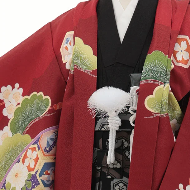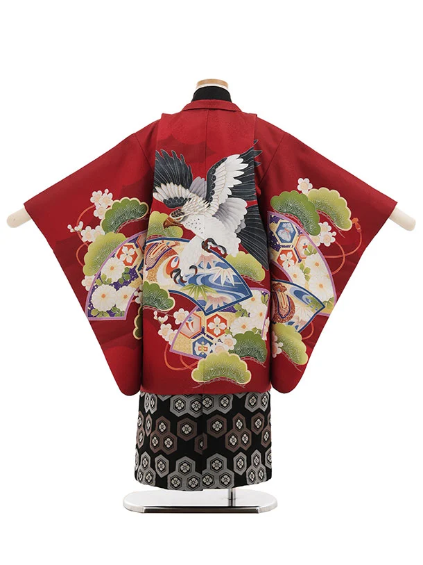 かんたん七五三(5歳男袴)X870 赤地扇絵に鷹×黒亀甲
