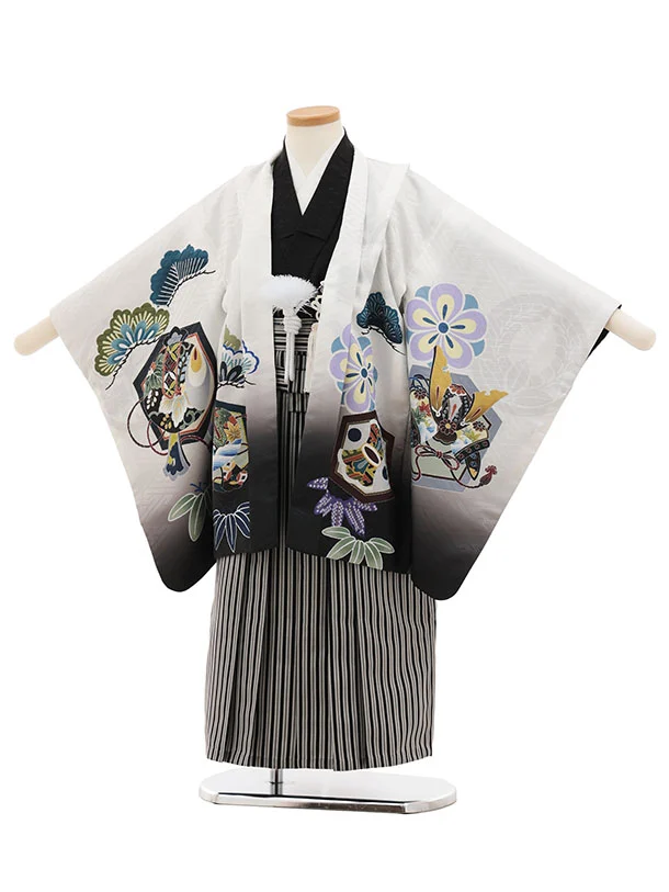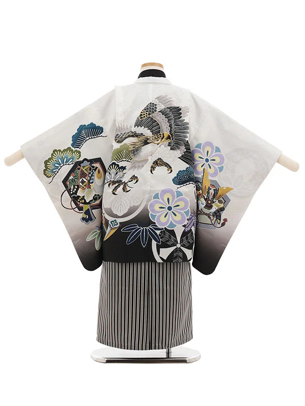 かんたん七五三(5歳男袴)X885 白地裾黒吉祥文様鷹×黒縞袴
