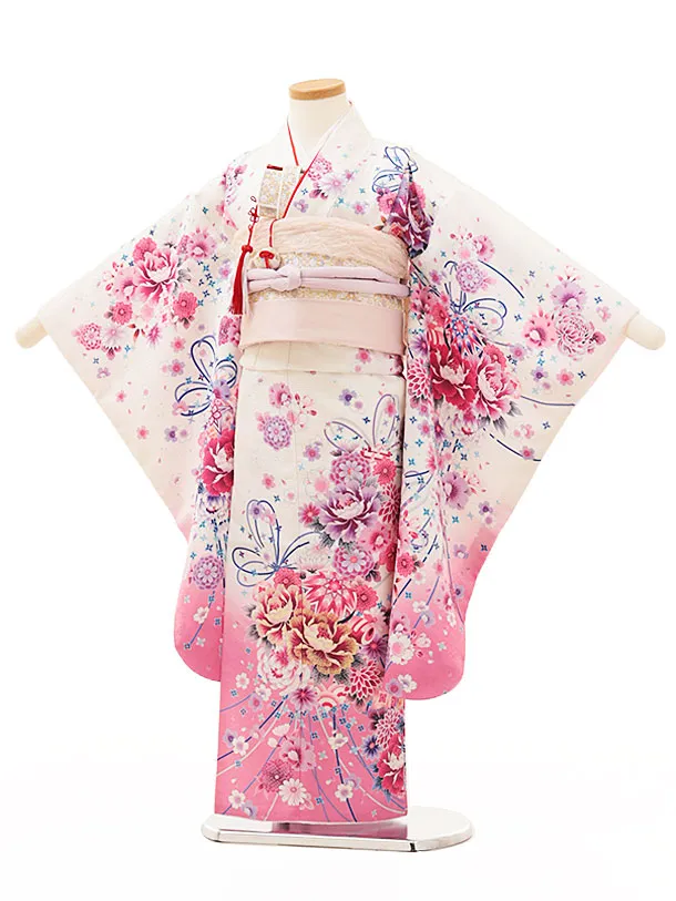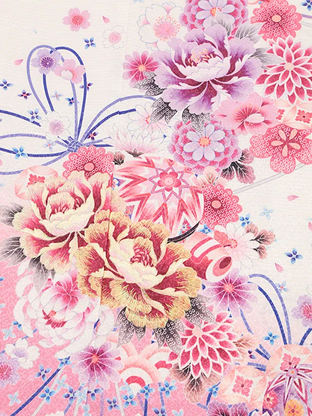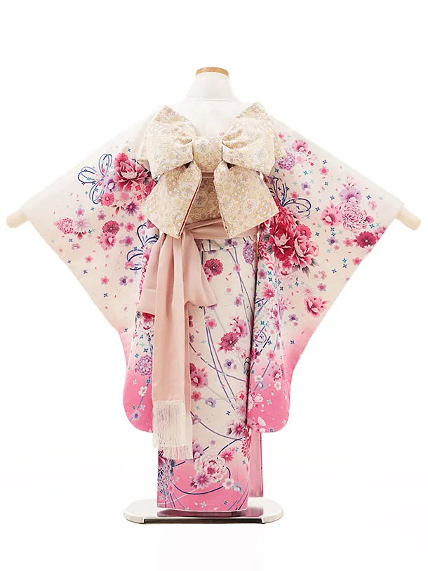 七五三(5歳女の子結び帯)0640 白地裾ピンク まり薬玉