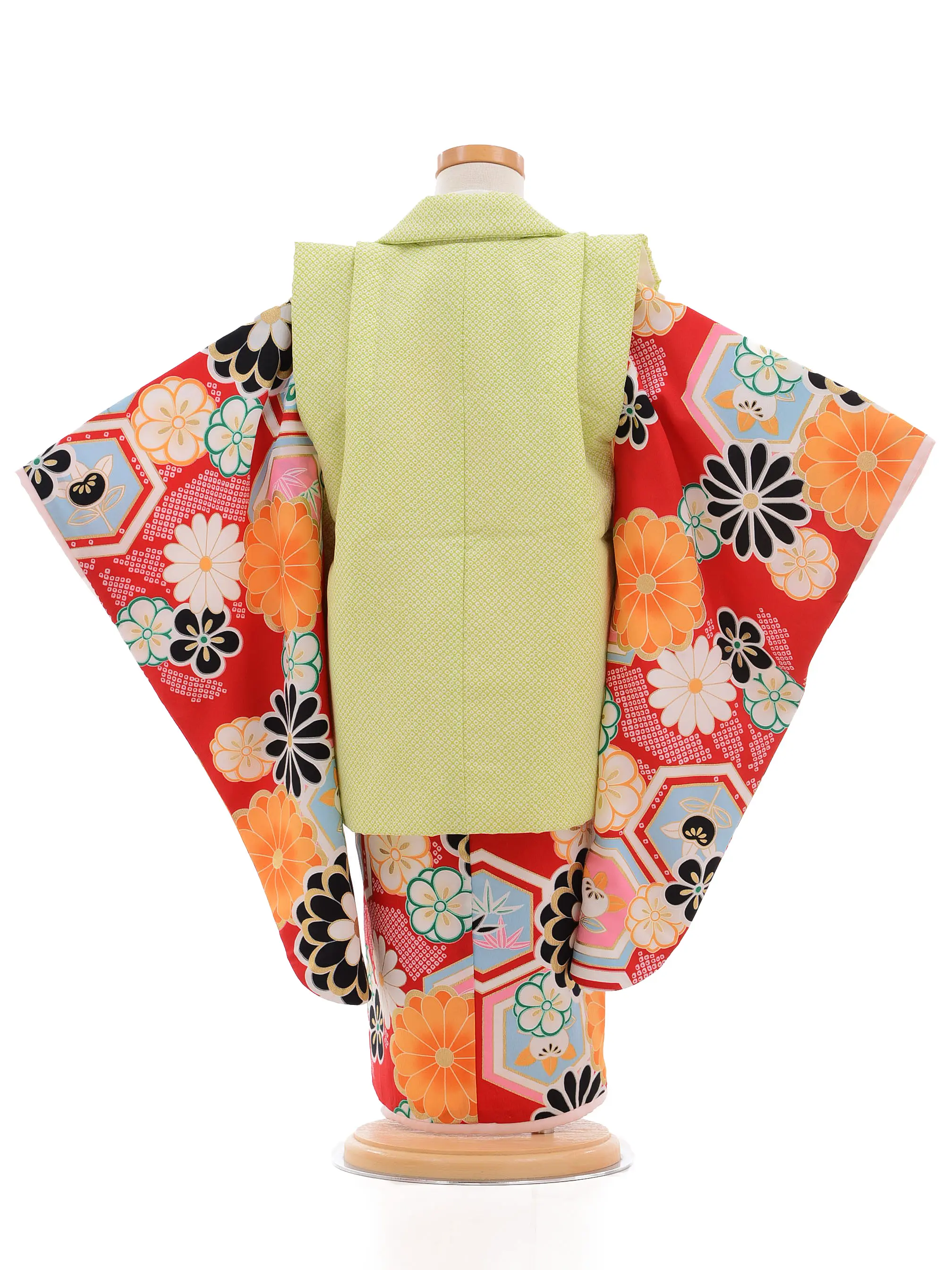 七五三レンタル(3歳女の子被布)3182ひいなグリーン×赤古