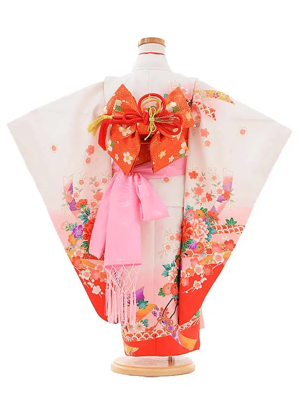 七五三レンタル(3歳女結び帯)3366 白地裾赤熨斗目花車