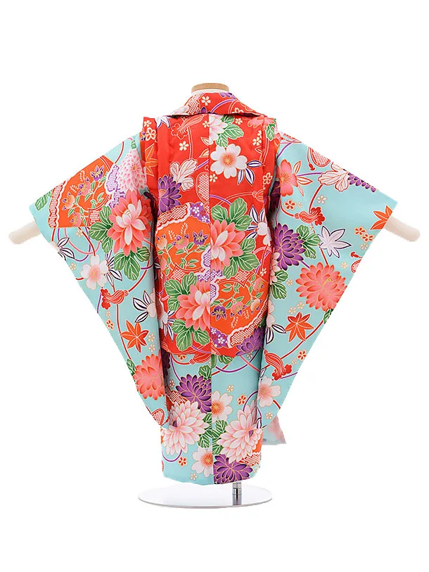 七五三レンタル(3歳女被布)3384 赤×水色 扇に花