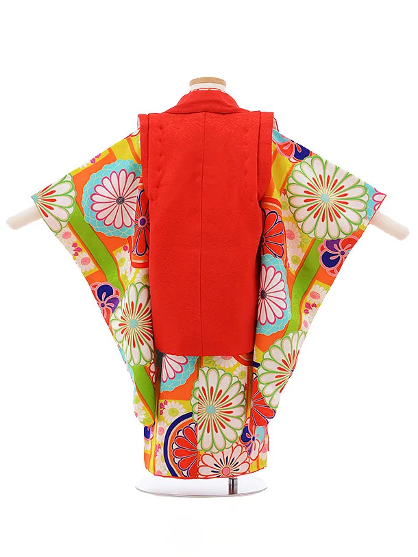 七五三レンタル(3歳女被布)3391 紅一点 赤×オレンジ地 菊