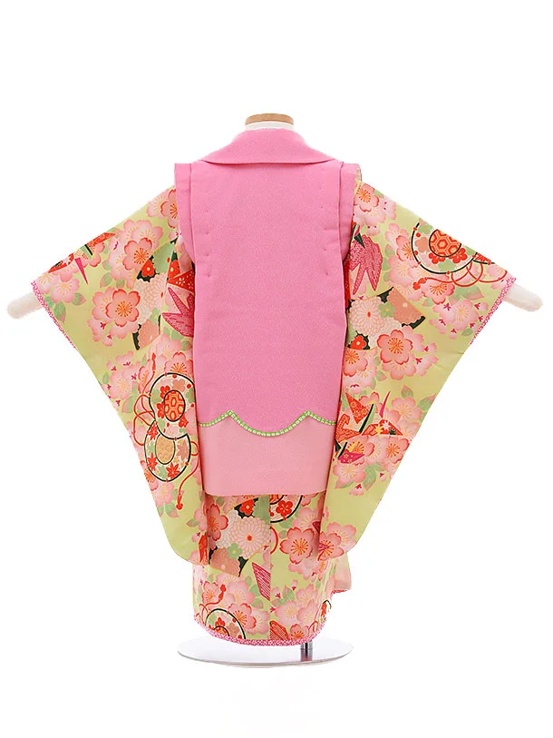 七五三レンタル(3歳女被布)3425乙葉 ピンク×若葉色 桜折鶴