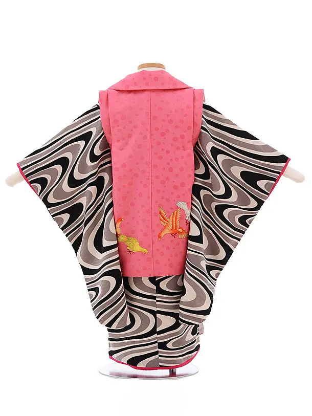 七五三レンタル(3歳女被布)3427モダンアンテナ ピンク×白黒 流水