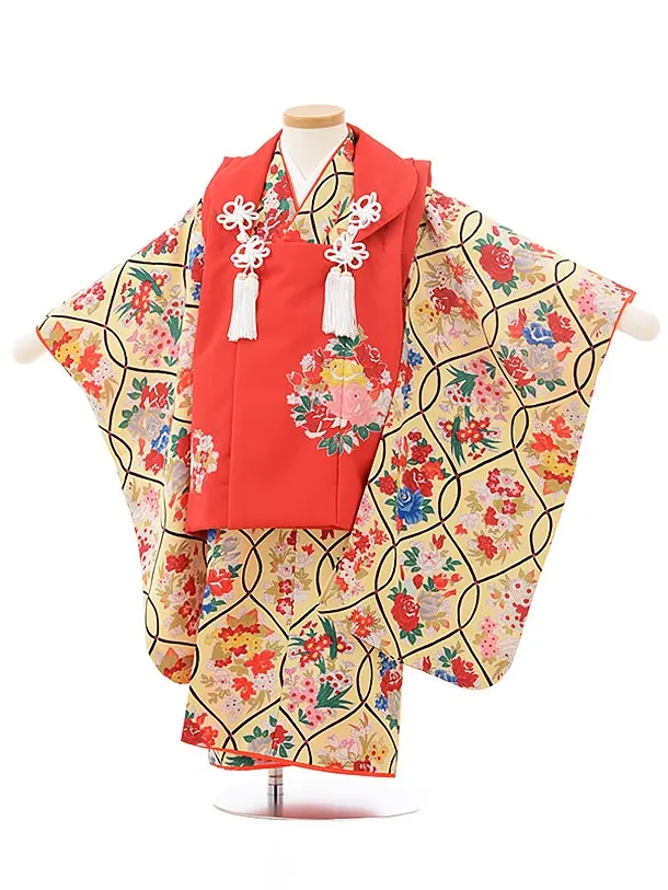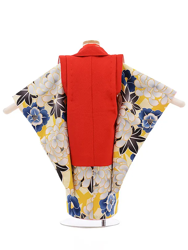 七五三レンタル(3歳女被布)3493 赤×からし色地 牡丹椿