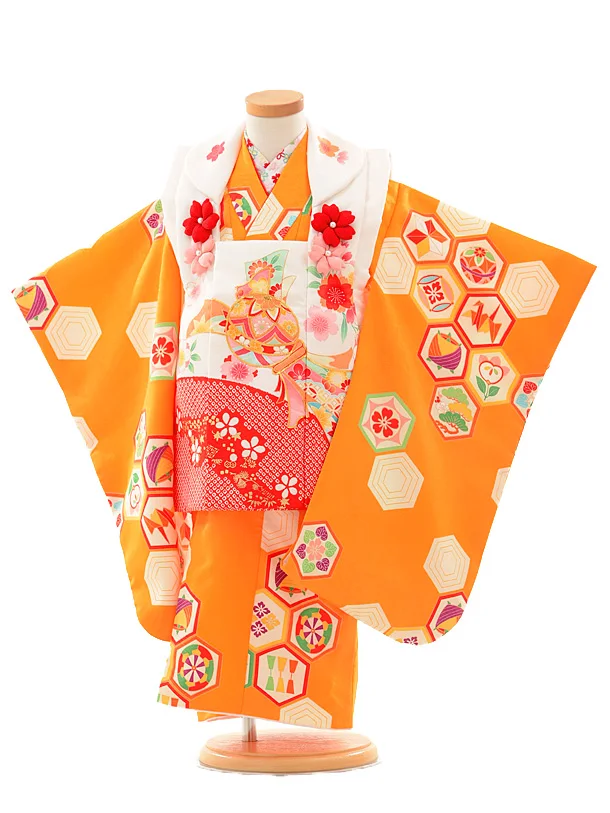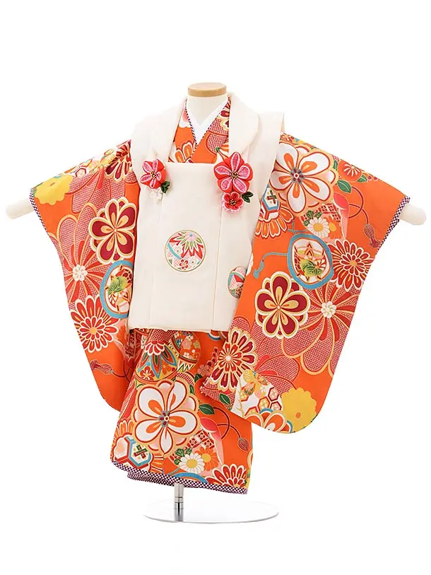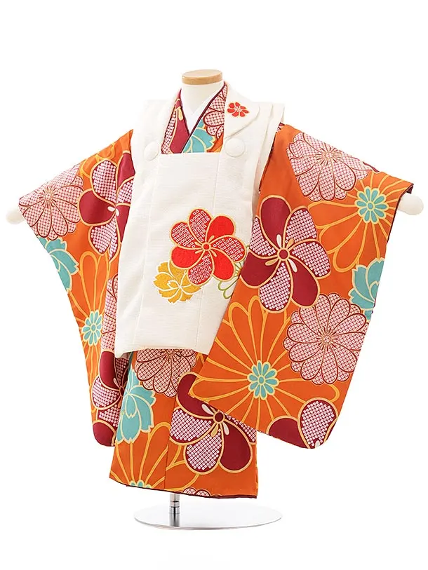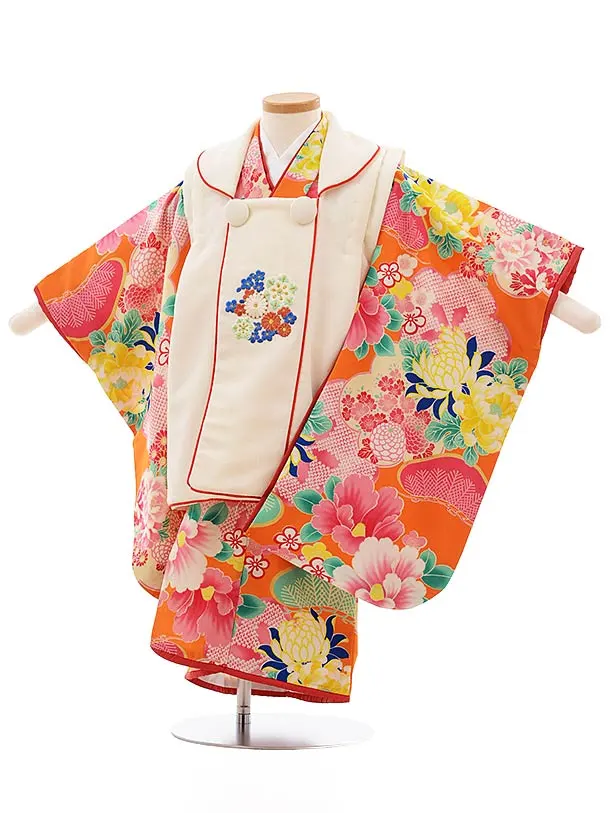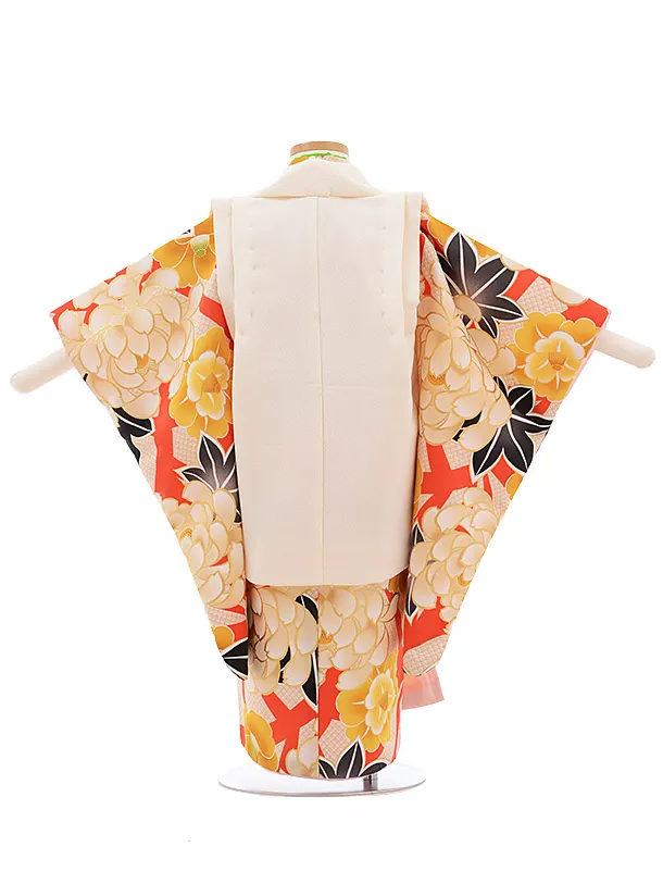 七五三レンタル(3歳女被布)3495 白×オレンジ色地 牡丹椿