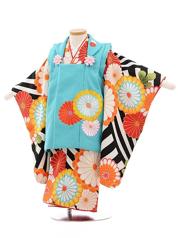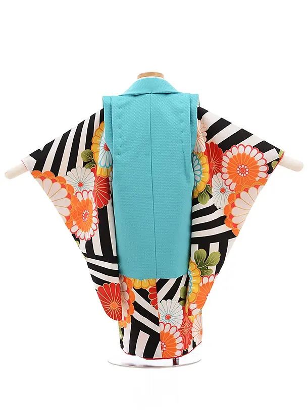 七五三(3歳女被布)3637 花わらべ ターコイズ×黒縞 菊