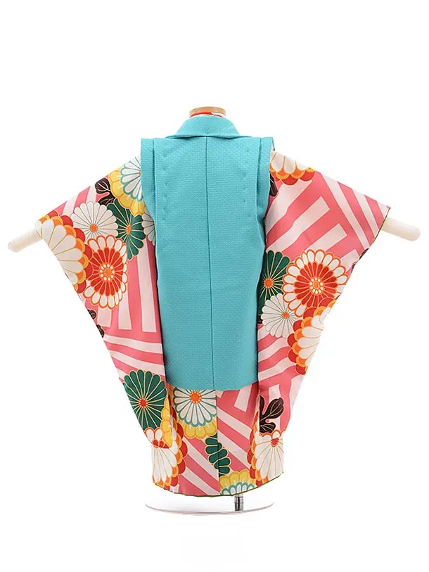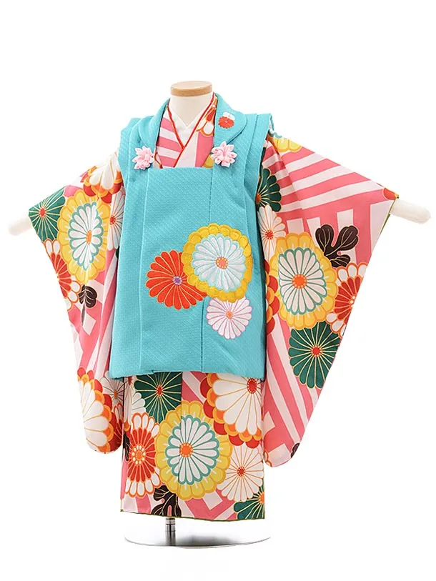 七五三(3歳女被布)3638 花わらべ ターコイズ×ピンク縞 菊