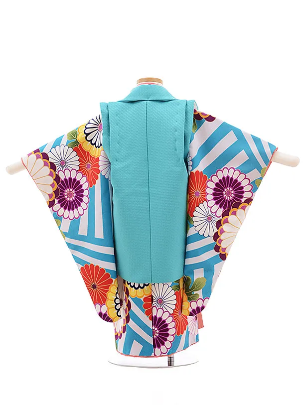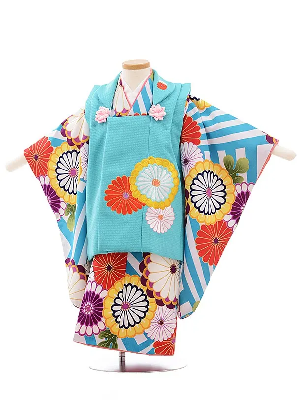 七五三(3歳女被布)3639 花わらべ ターコイズ×ブルー縞 菊