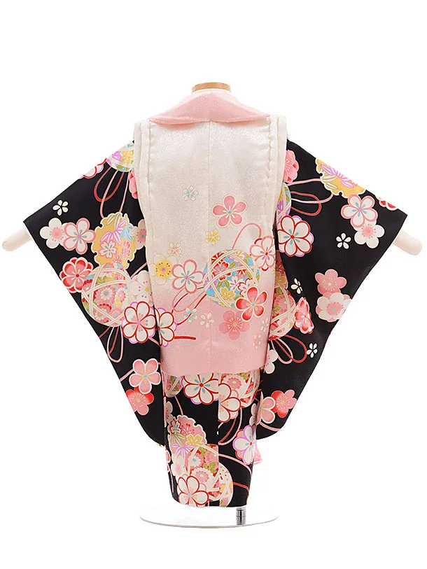 七五三(3歳女被布)3649 正絹 白ピンクぼかし×黒地 まり 梅