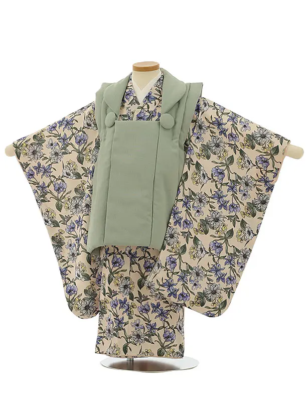 七五三レンタル(3歳女児被布)3685 ベージュ淡グリーン小花