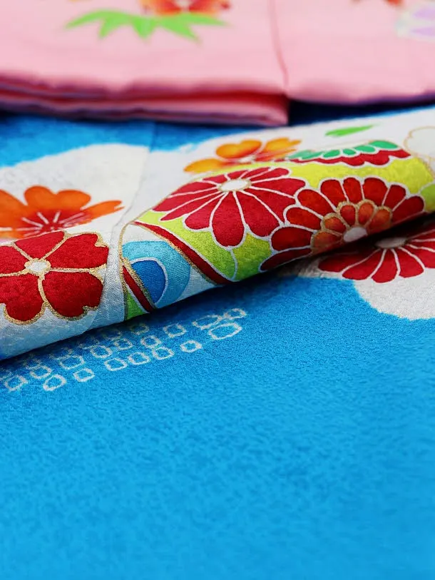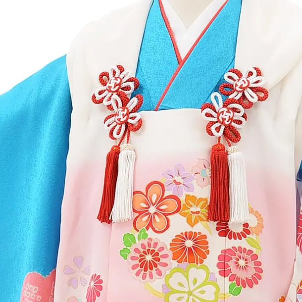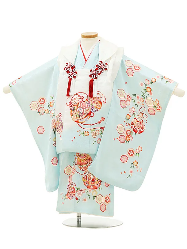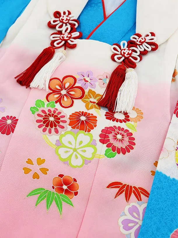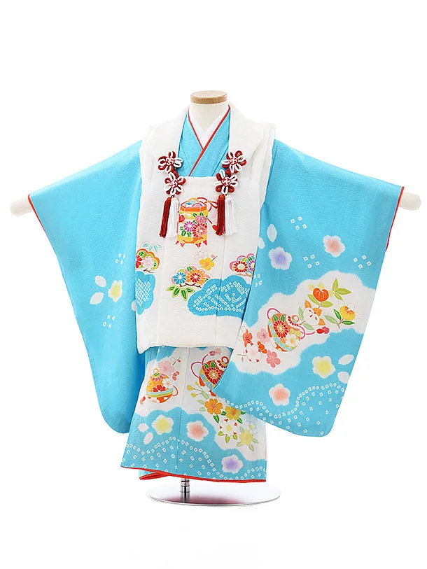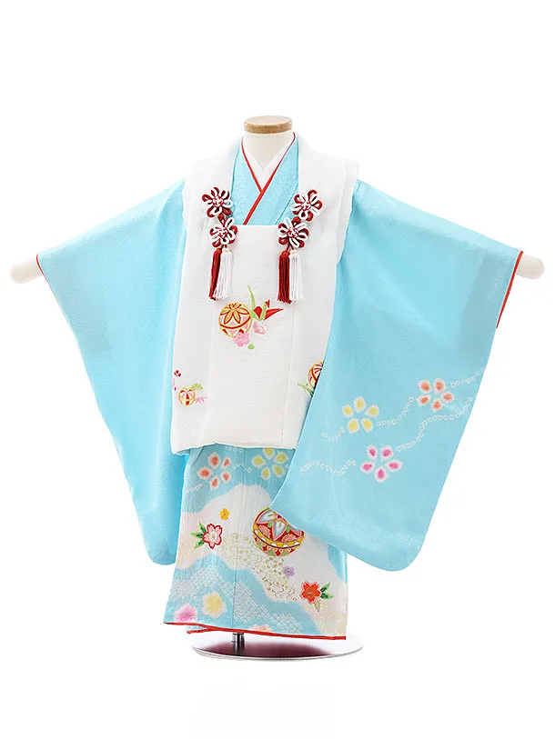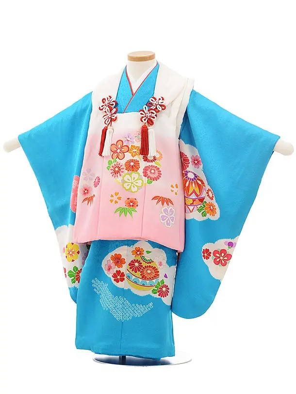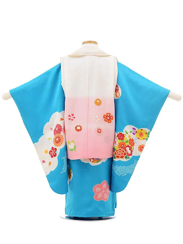 七五三レンタル(3歳女の子被布) 正絹3739白ピンク ×ブルー地雲取り花
