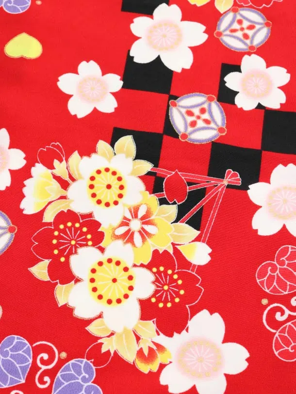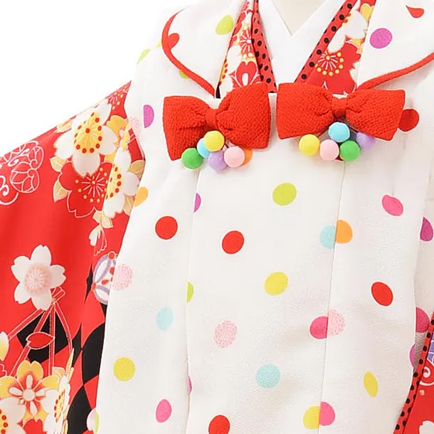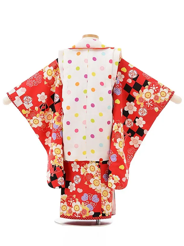 七五三レンタル(3歳女児被布)3834白地カラフルドット×赤市松桜