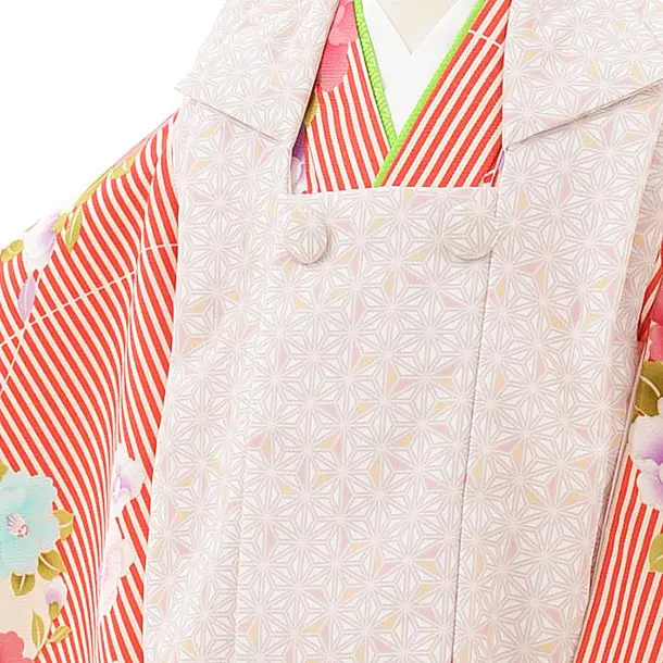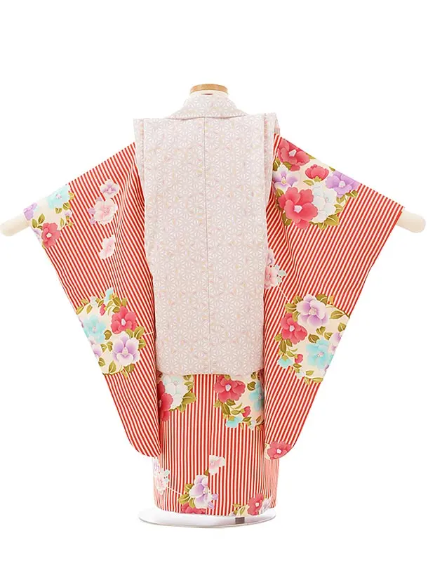 七五三レンタル(3歳女児被布)3848 ベージュ麻の葉×赤ストライプ椿