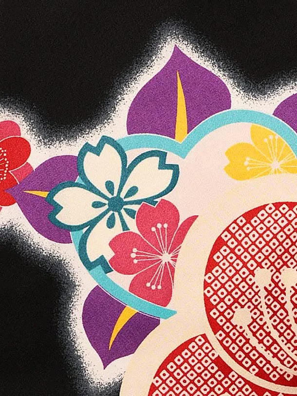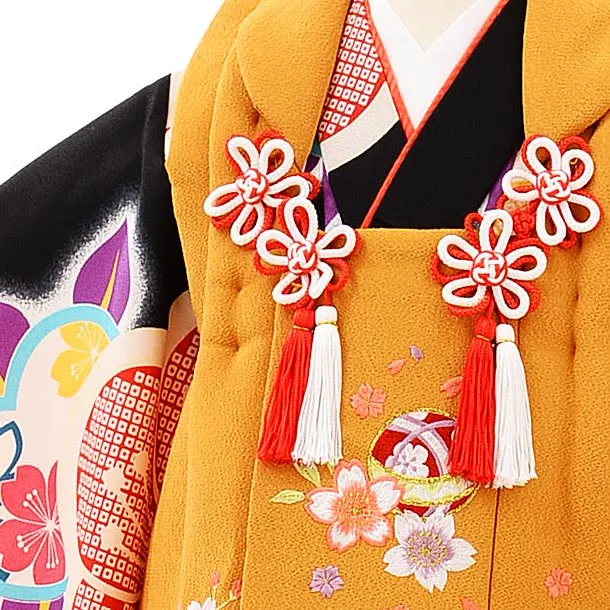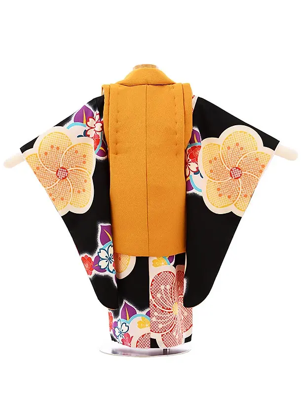 七五三レンタル(3歳女児被布)3935からし色刺繍桜x黒地ねじり梅