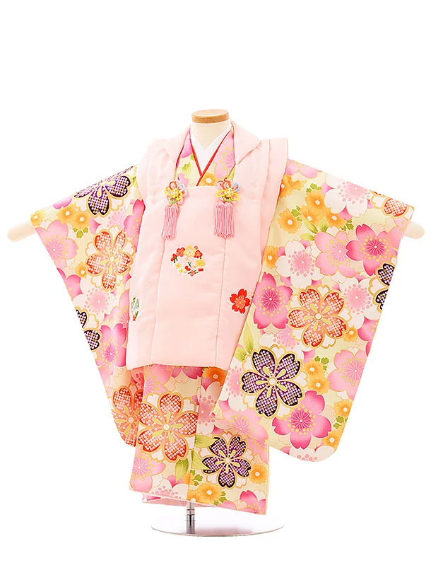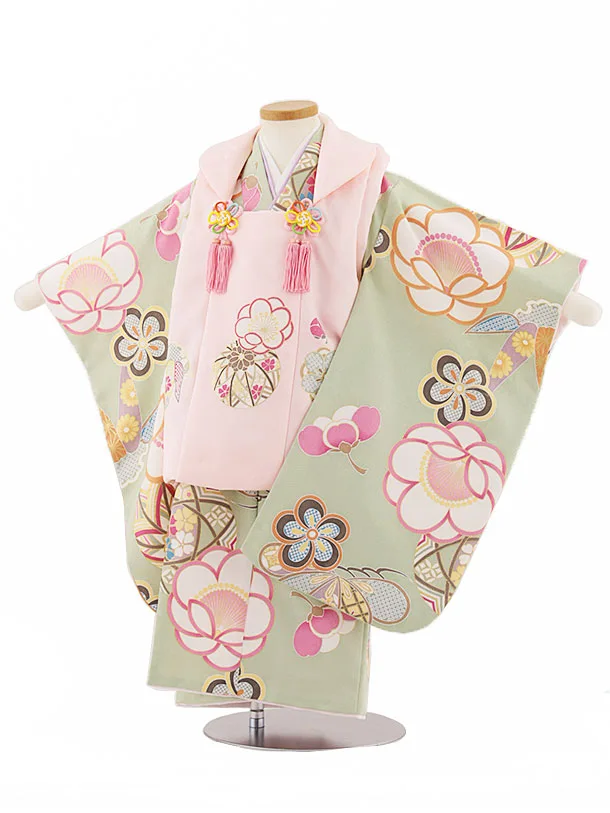 七五三レンタル(3歳女児被布)3946ピンク刺繍梅桜xうすグリーン桜