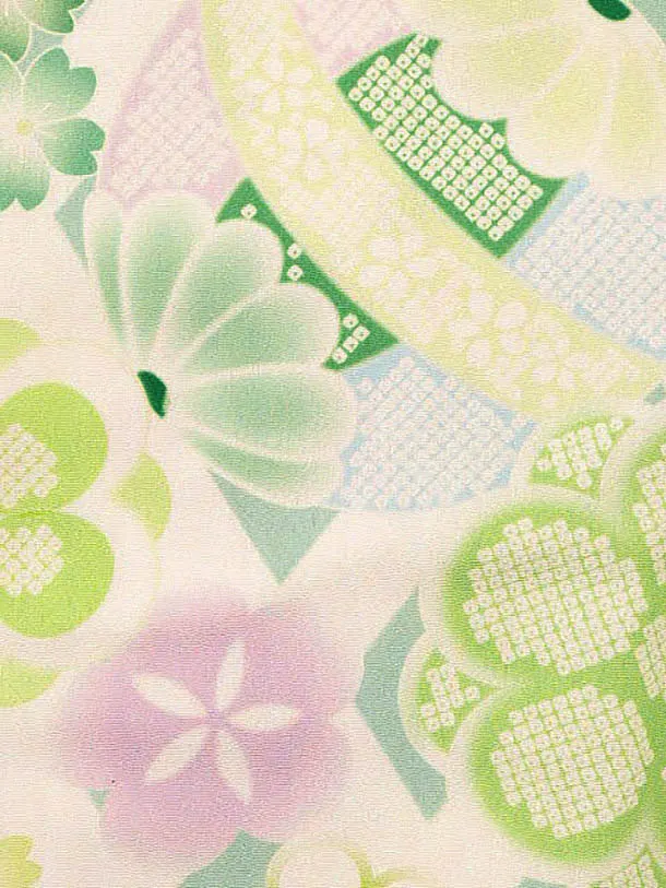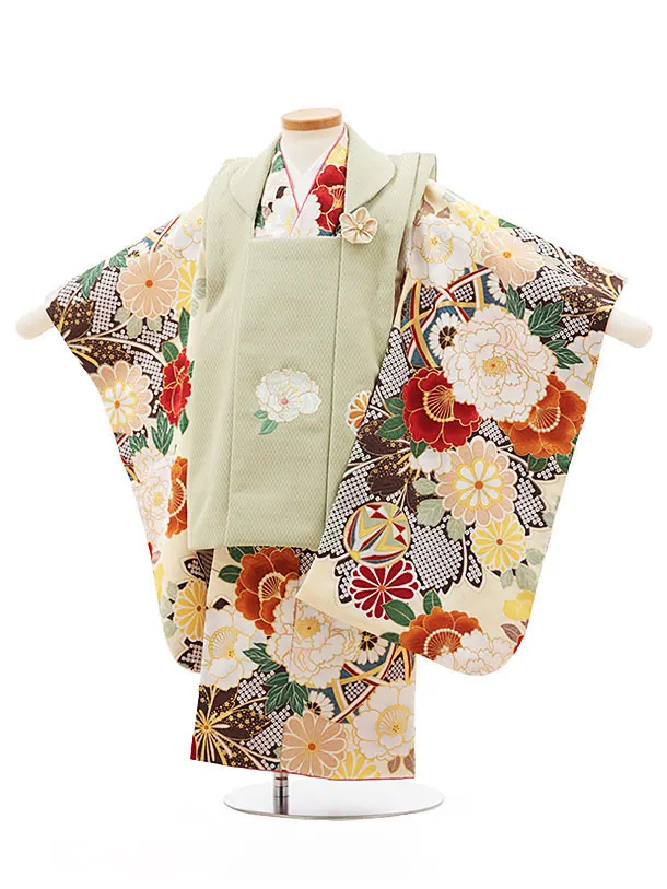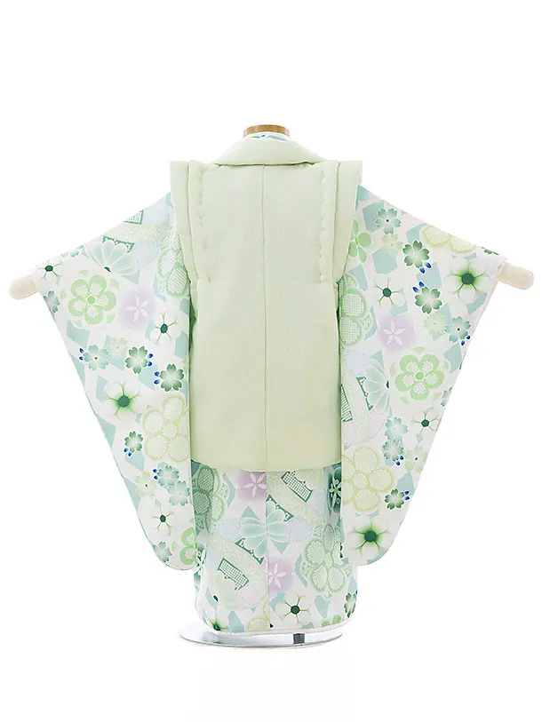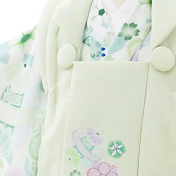 七五三レンタル(3歳女児被布)3995ヒワ色x白グリーンまり梅