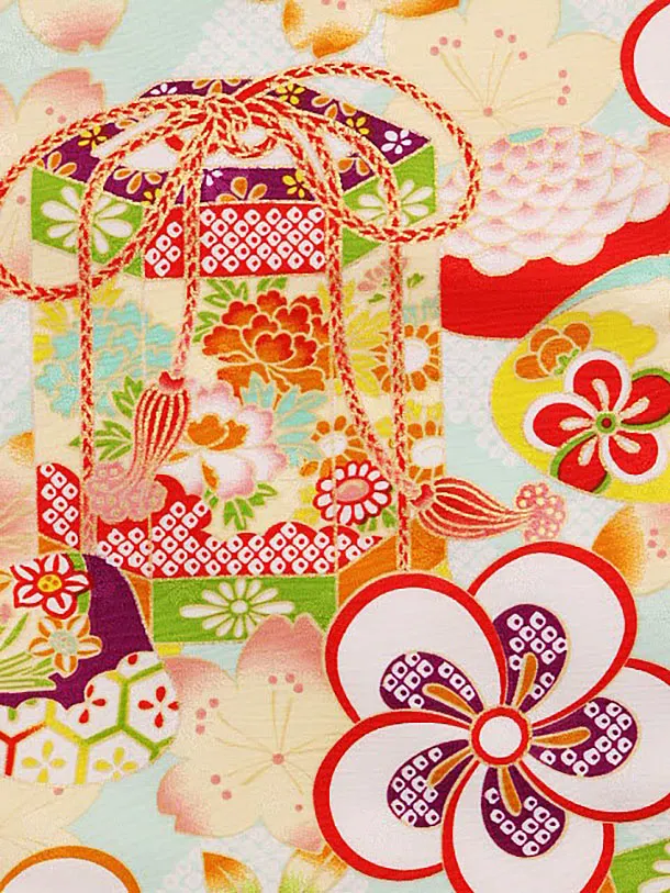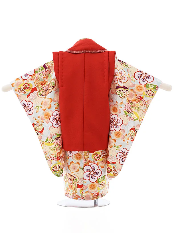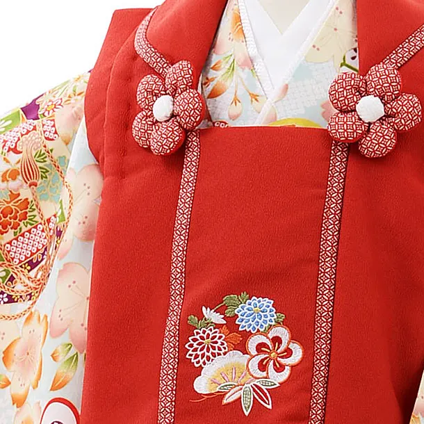七五三レンタル(3歳女児被布)4014赤刺繍花x水色ねじり梅貝桶