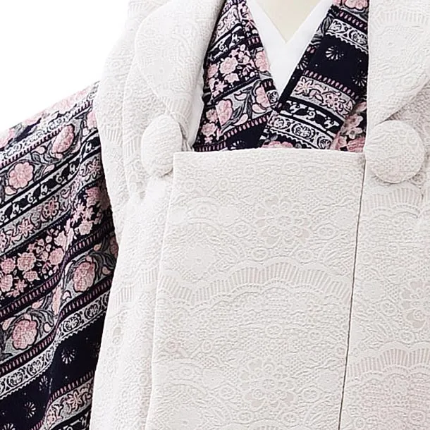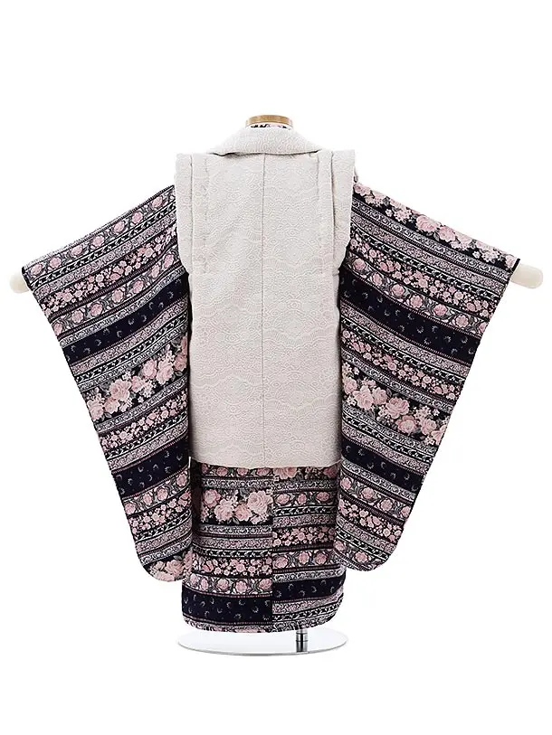 七五三レンタル(3歳女児被布)4054ベージュレース柄x紺地ピンクバラ