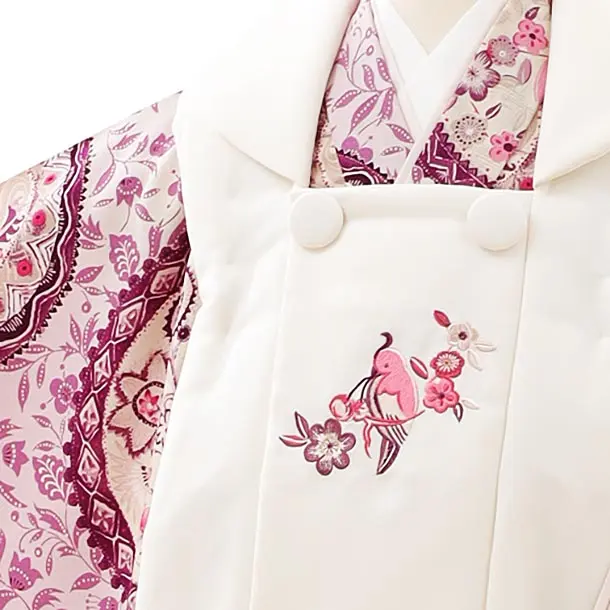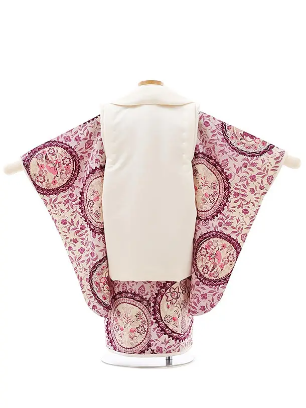 七五三レンタル(3歳女児被布)4063九重 クリーム色小鳥x パープル更紗