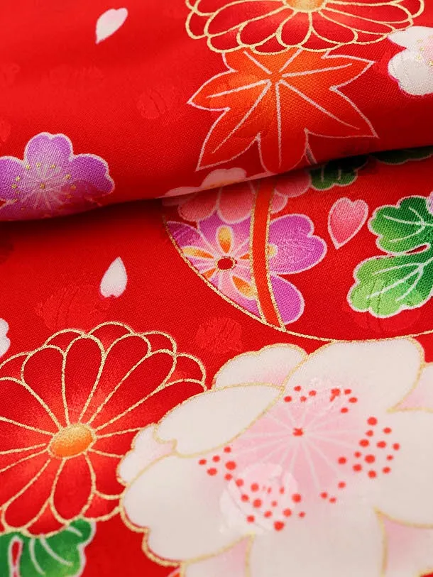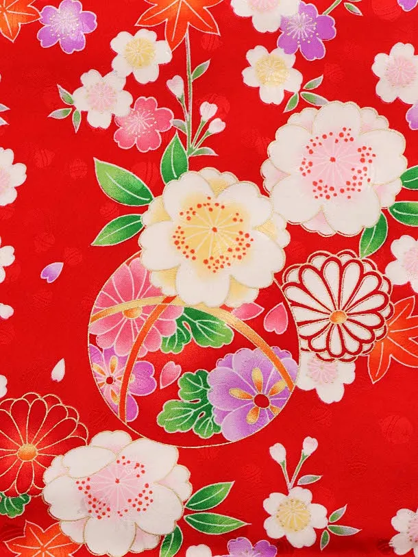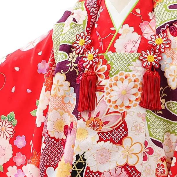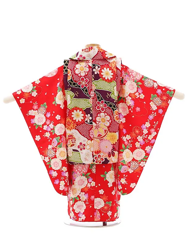 七五三レンタル(3歳女児被布)4066【正絹】多色小紋梅菊x赤地桜