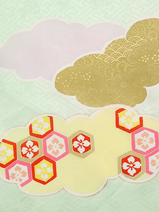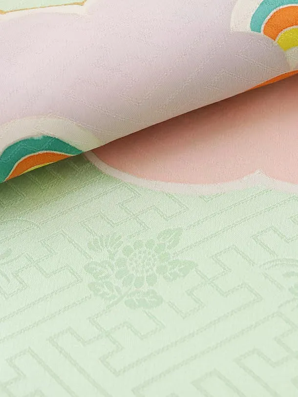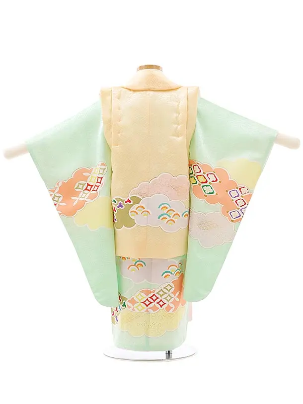 七五三レンタル(3歳女児被布)4072【正絹】うすオレンジxヒワ色雲取り