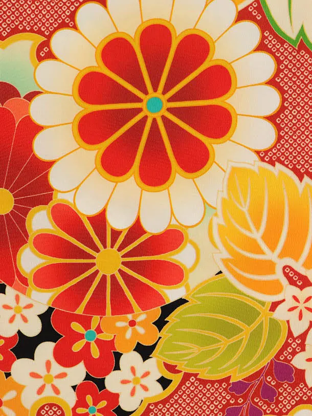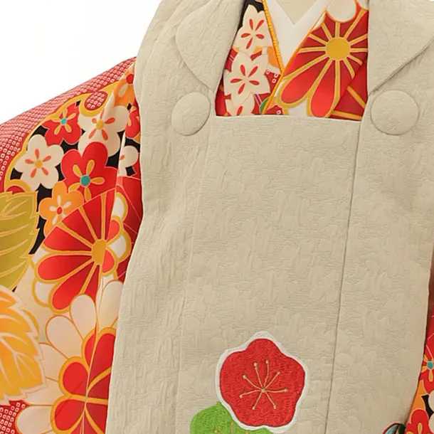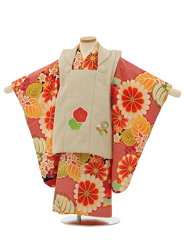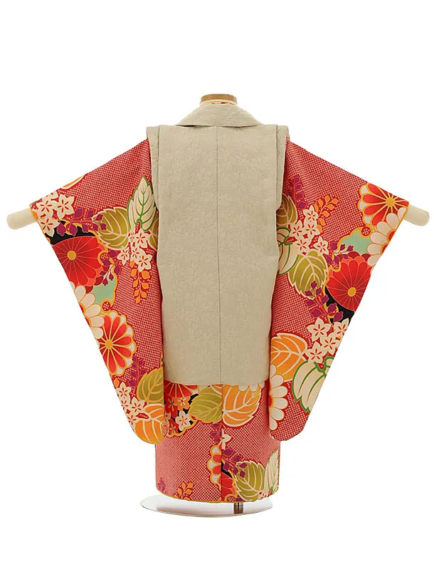 七五三レンタル(3歳女児被布)4109ベージュ刺繍菊x赤地疋田柄菊桐