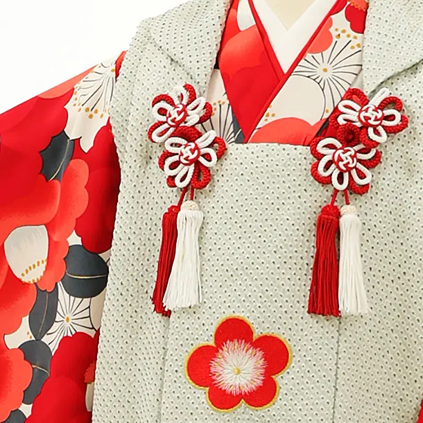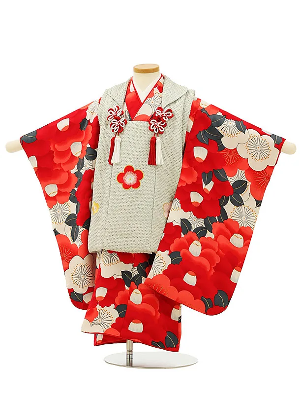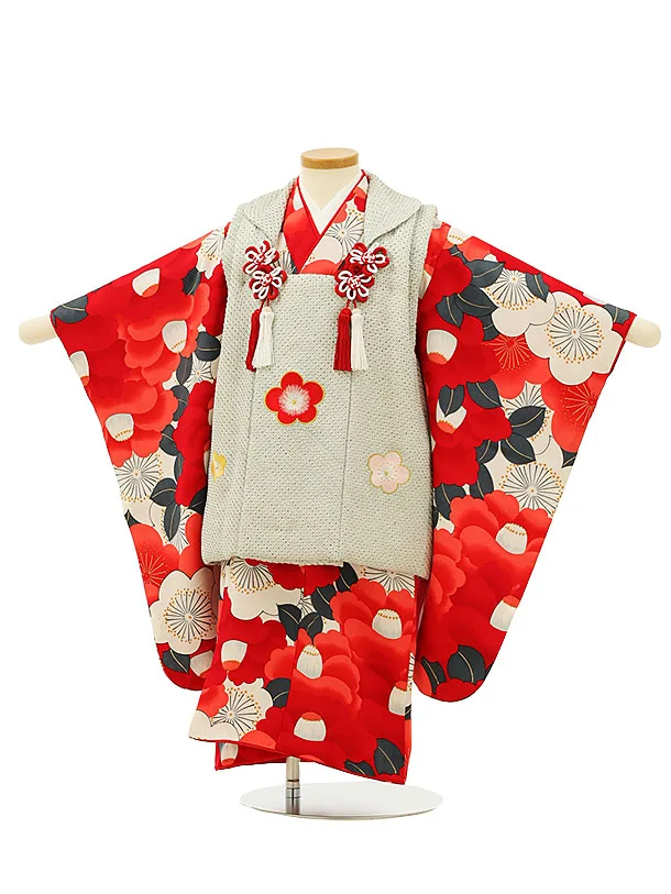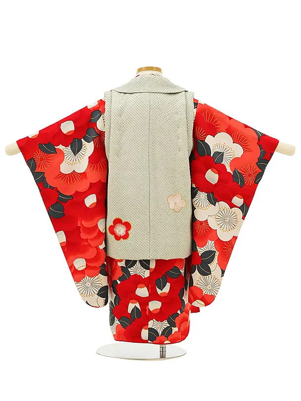 七五三(3歳女児被布)【正絹】4127うすグリーン絞りx赤椿白梅