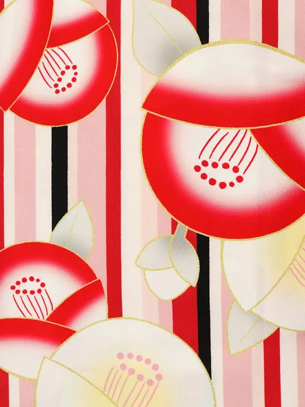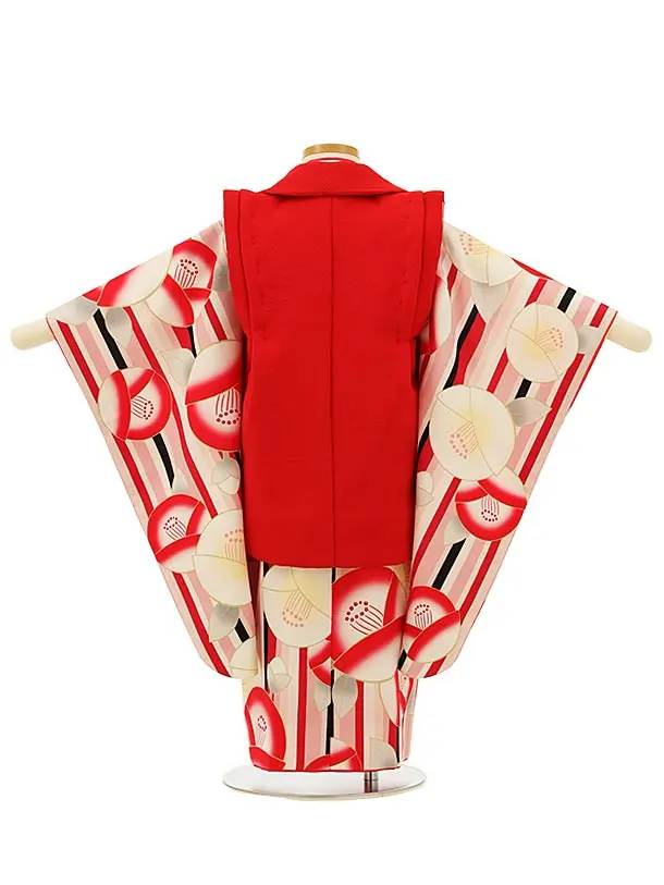 七五三レンタル(3歳女児被布)4138赤刺繍花車xピンク赤ストライプ椿