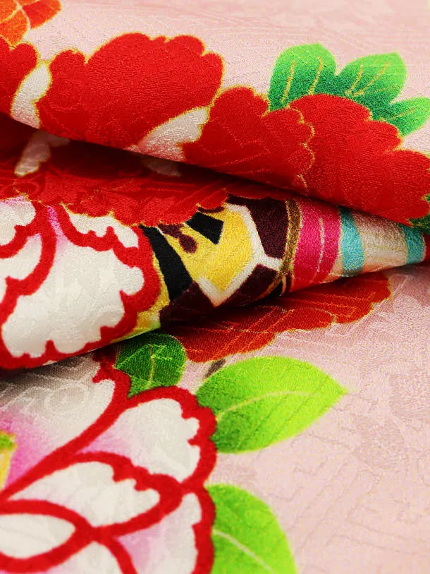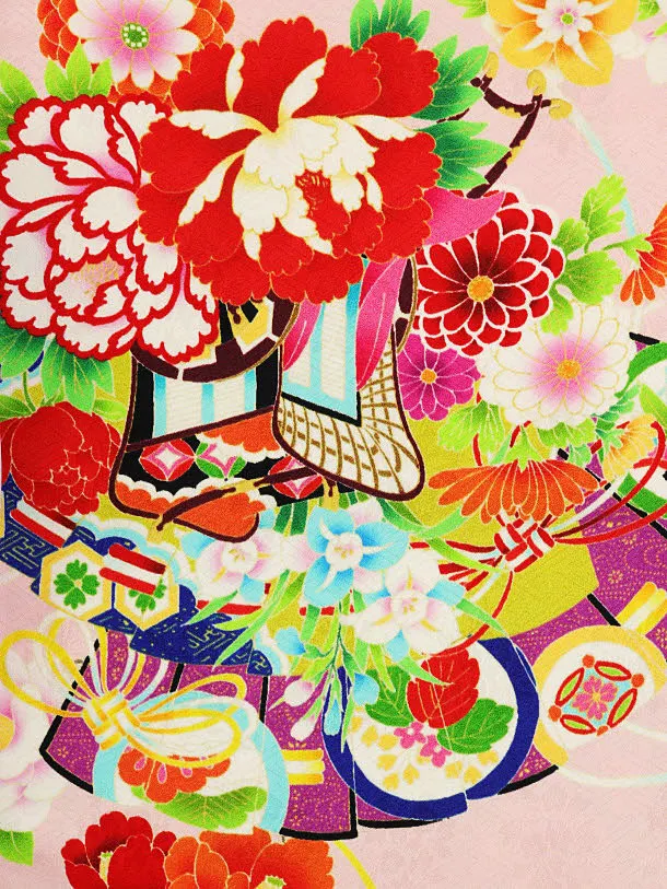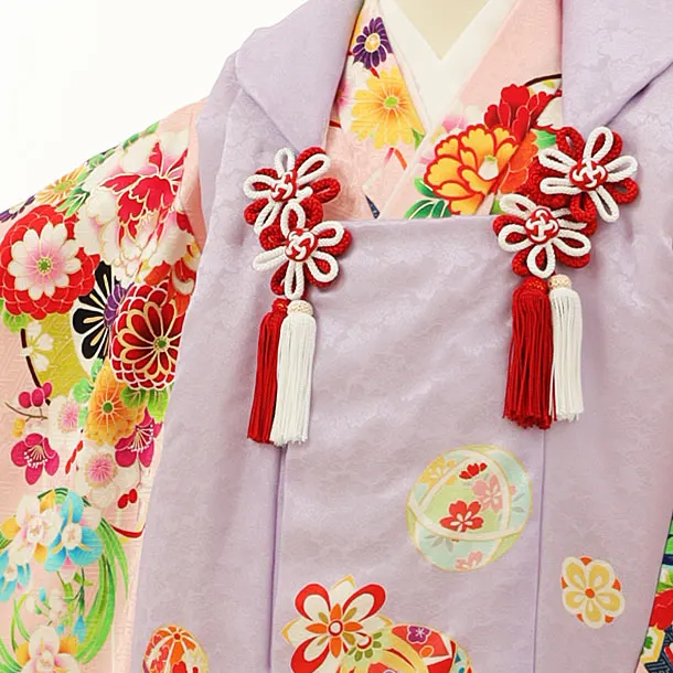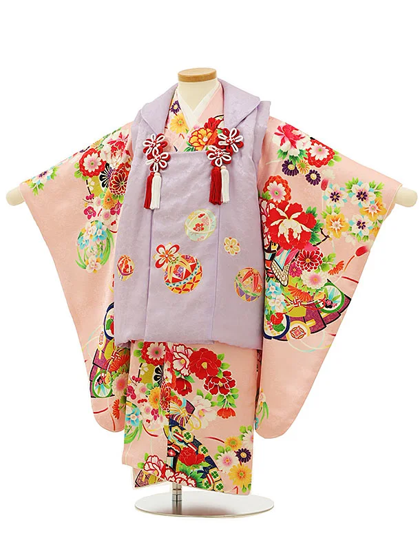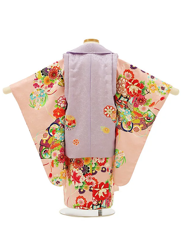 七五三レンタル(3歳女児被布)【正絹】4164薄紫地まりxピンク扇御所車ぼたん