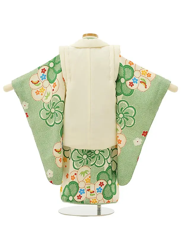 七五三(3歳女児被布)4230オフホワイト刺繍菊梅×緑ねじり梅