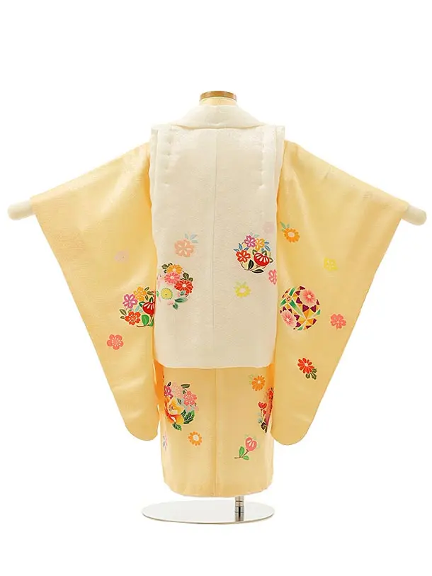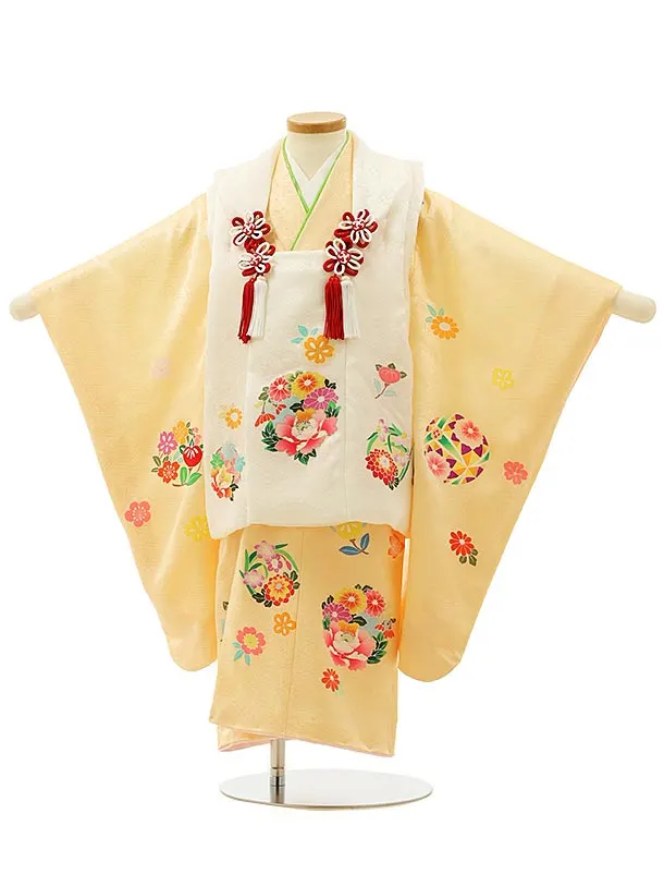 七五三レンタル(3歳女児被布)4253【正絹】白×たまご色牡丹花