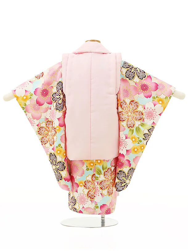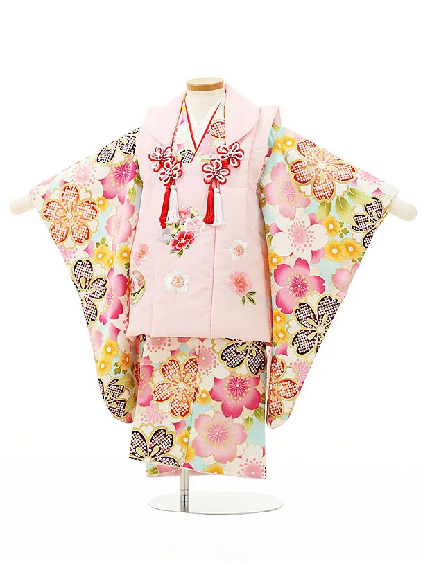 七五三レンタル(3歳女児被布)4310ピンク刺繍椿x水色桜