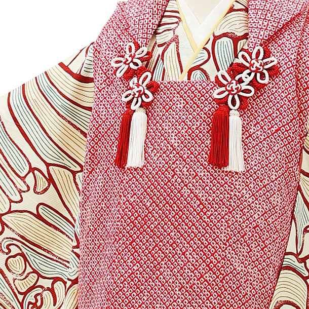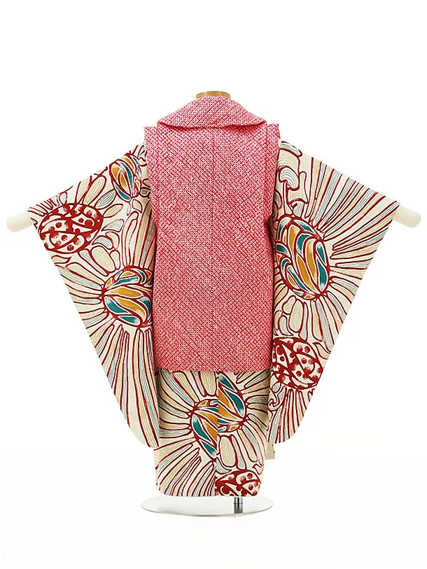 七五三レンタル(3歳女児被布)4325【正絹】赤絞りxアイボリー大花
