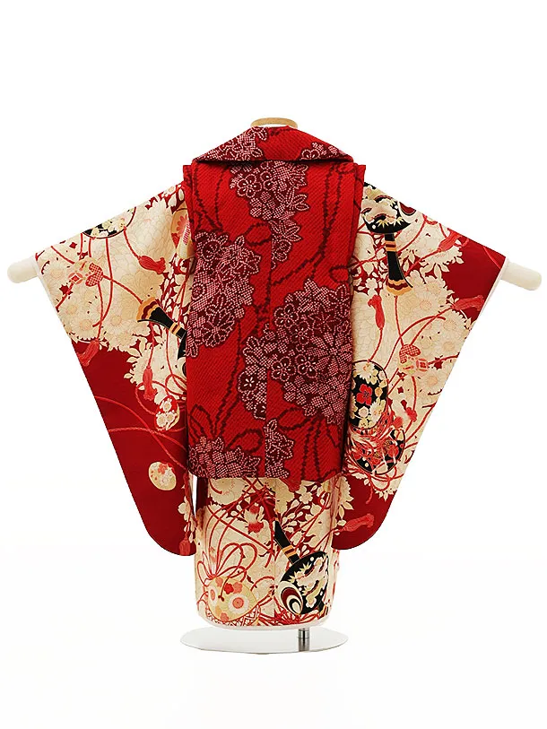 七五三レンタル(3歳女児被布)4366華徒然赤x赤桜花薬玉