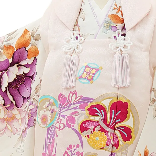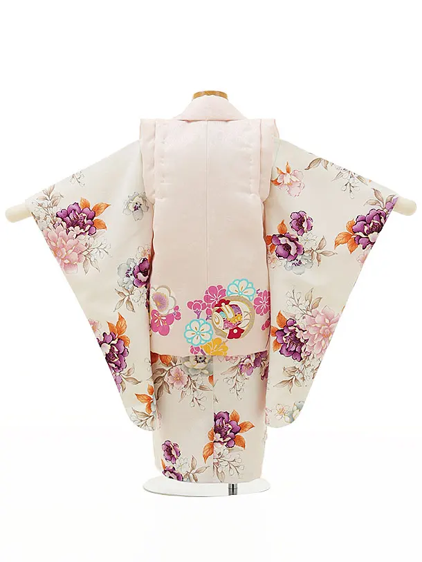 七五三レンタル(3歳女児被布)4415ピンク花丸吉祥文様x淡ブルーブーケ