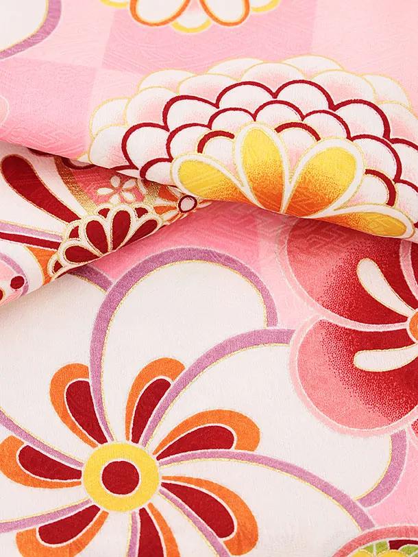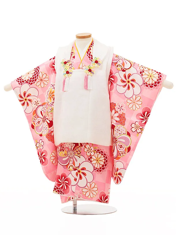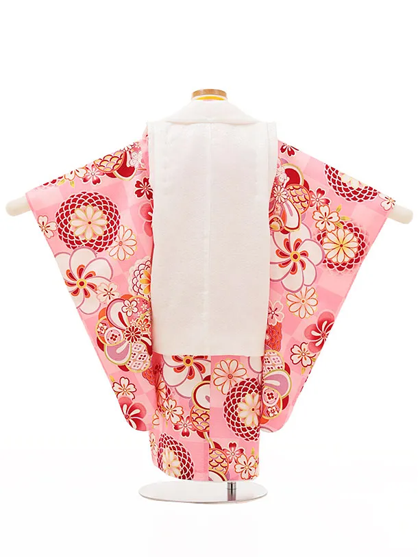 七五三レンタル(3歳女児被布)4438【正絹】白xピンク市松菊